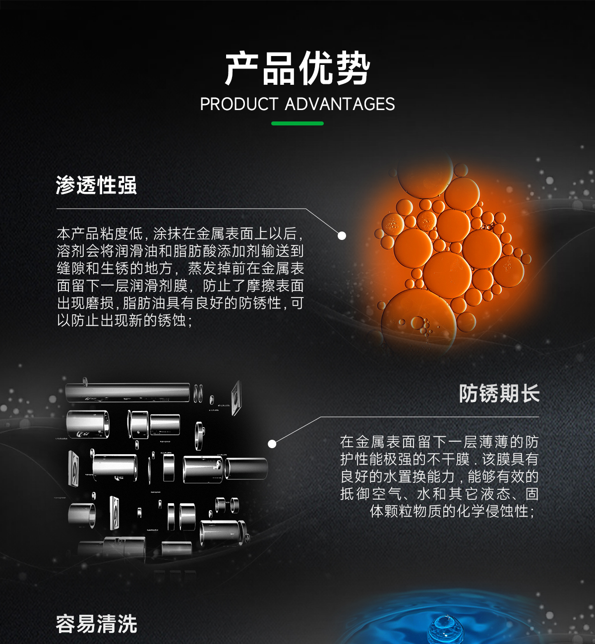 1、渗透性强:本产品粘度低,涂抹在金属表面上以后,溶剂会将润滑油和脂肪酸添加剂输送到缝隙和生锈的地方,蒸发掉前在金属表面留下一层润滑剂膜,防止了摩擦表面出现磨损,脂肪油具有良好的防锈性,可以防止出现新的锈蚀;