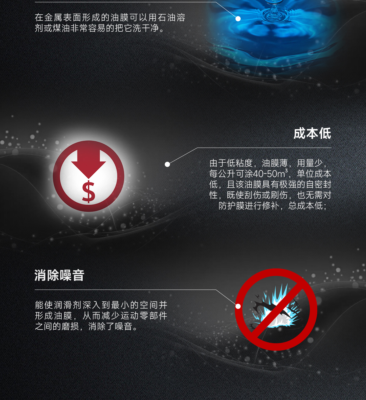 4、成本低:由于低粘度,油膜薄,用量少,每公升可涂 40-50m3,单位成本低,且该油膜具有极强的自密封性,既使刮伤或刷伤,也无需对防护膜进行修补,总成本低;