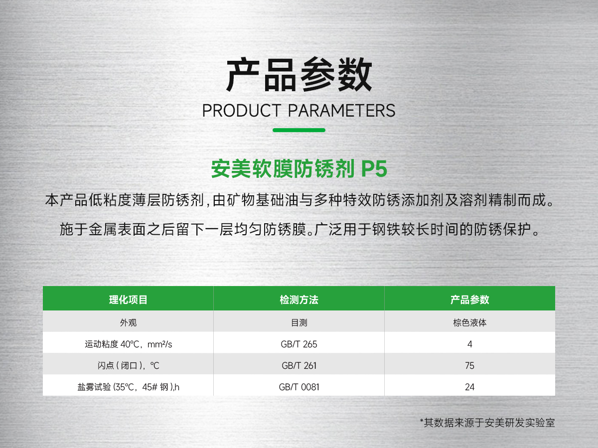 关于安美软膜防锈剂P5的其它具体指标参数,请移步”安美商城”下载MSDS和TDS报告浏览,或直接防锈剂生产厂家-安美集团客服热线400-7788-123/客服微信18576991625查询索取。