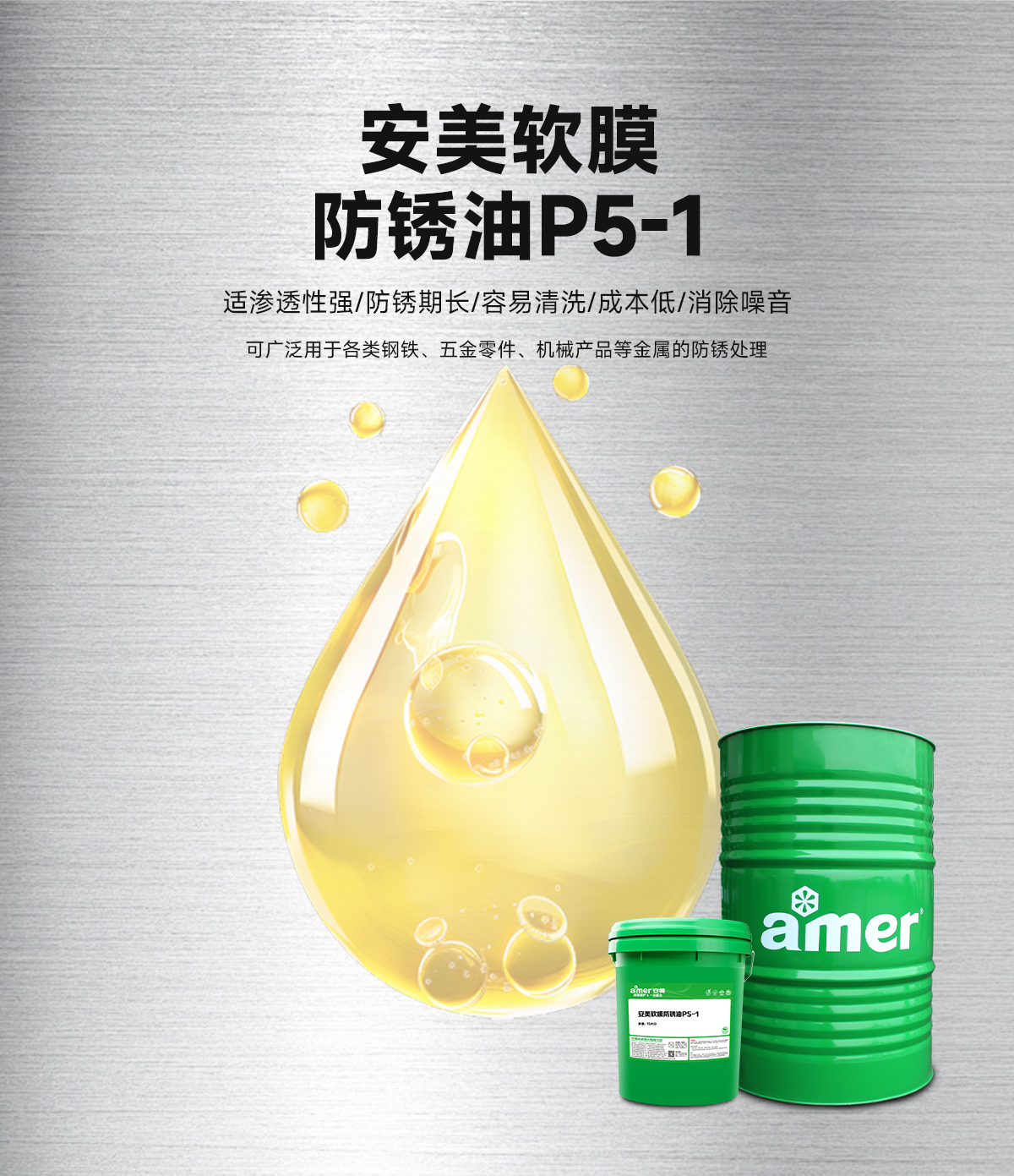 安美软膜防锈剂P5-1是低粘度薄层防锈剂,由矿物基础油与多种特效防锈添加剂及溶剂精制而成。施于金属表面之后留下一层均匀防锈膜。广泛用于钢铁较长时间的防锈保护。