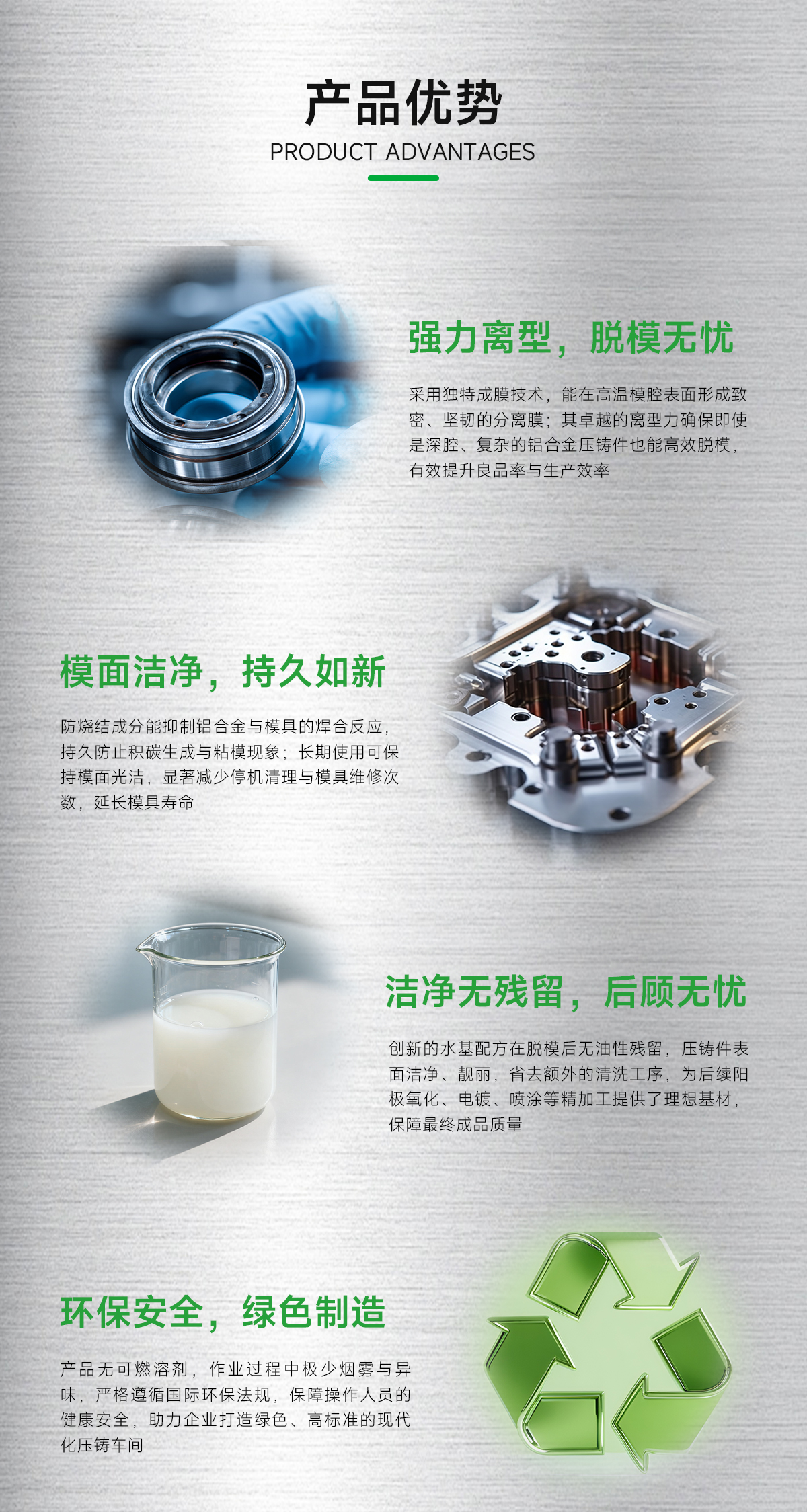 安美特级铝合金脱模剂 DC340是为现代高速、高负荷的金属精密压铸而开发的一款合成型水基脱模离型剂,拥有超强脱模性和特殊的模面防烧结特性,使模面保持干净无积碳,压铸制程顺利,控制渣料附着于模面;合成高分子水基配方体系具有不燃性、少烟、无污染之特性,提供了绝佳的干净、安全、健康的生产作业环境。