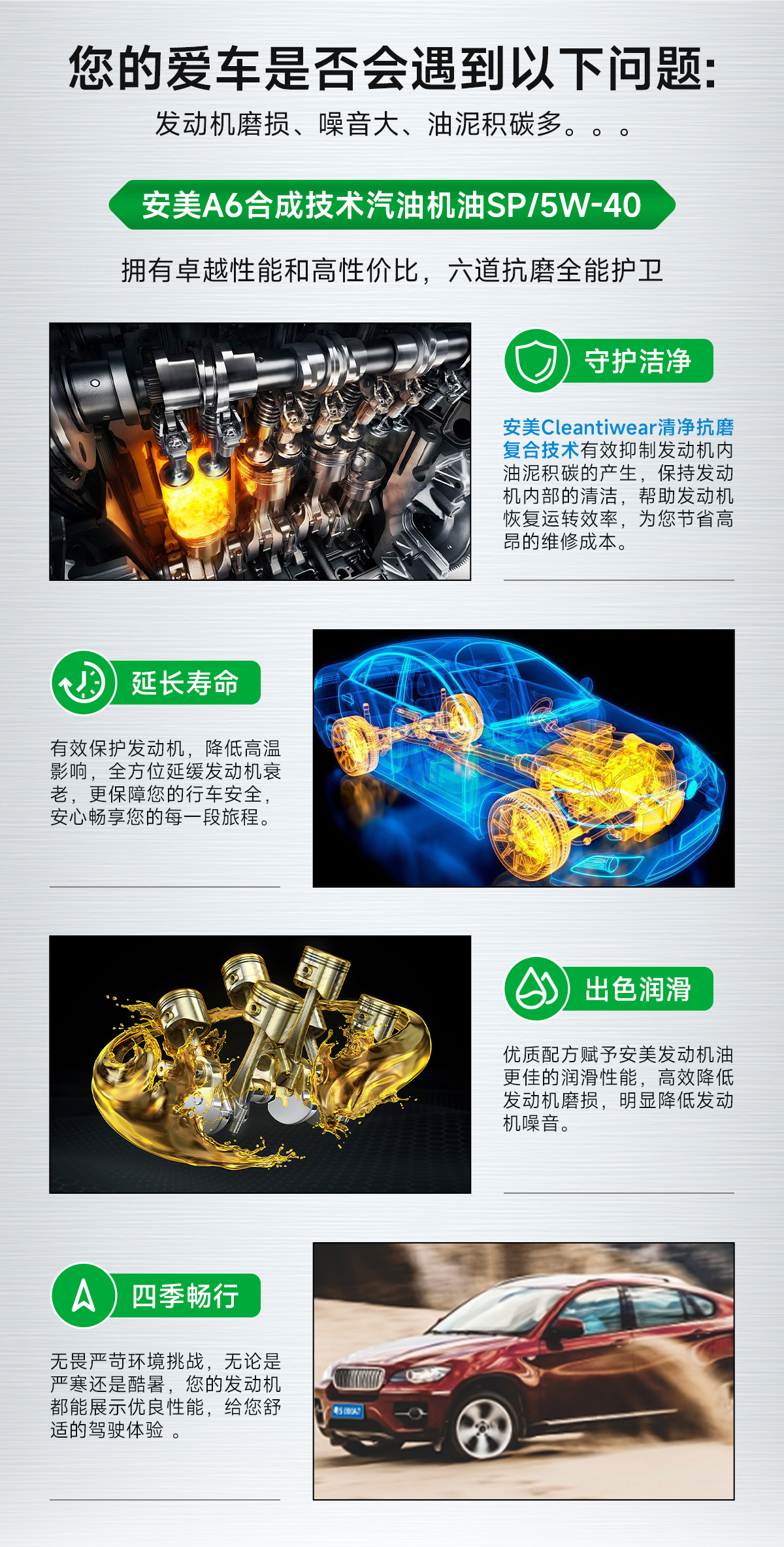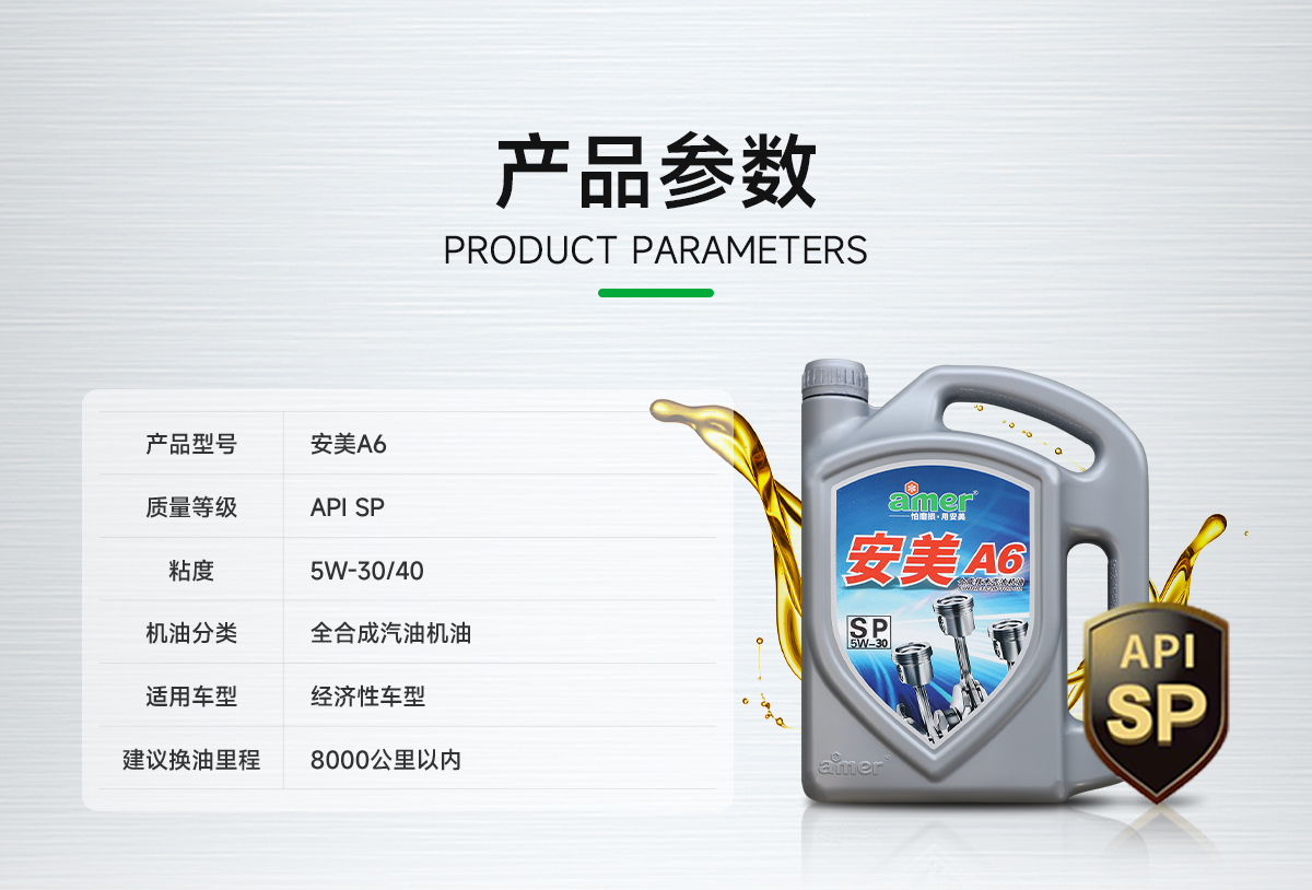 安美A6采用高品质合成基础和全球领先的 Cleantiwear+清净抗磨损复合技术调配而成,具备卓越的抗磨性能和清洁能力,可为采用多气阀、可变气门和缸内直喷等新技术发动机的各种轿车提供卓越保护,消除摩擦功效优异,可明显降低发动机噪音。