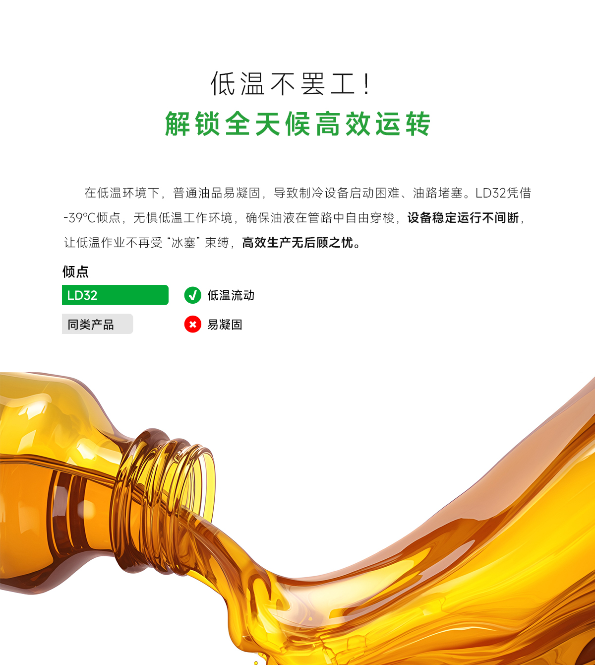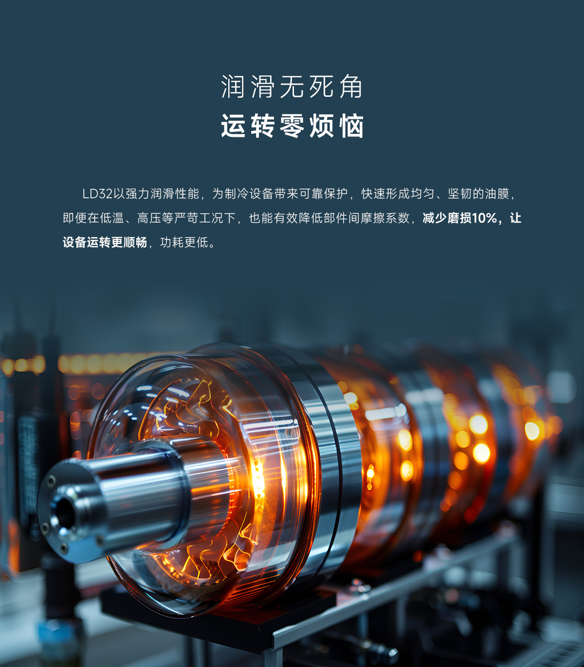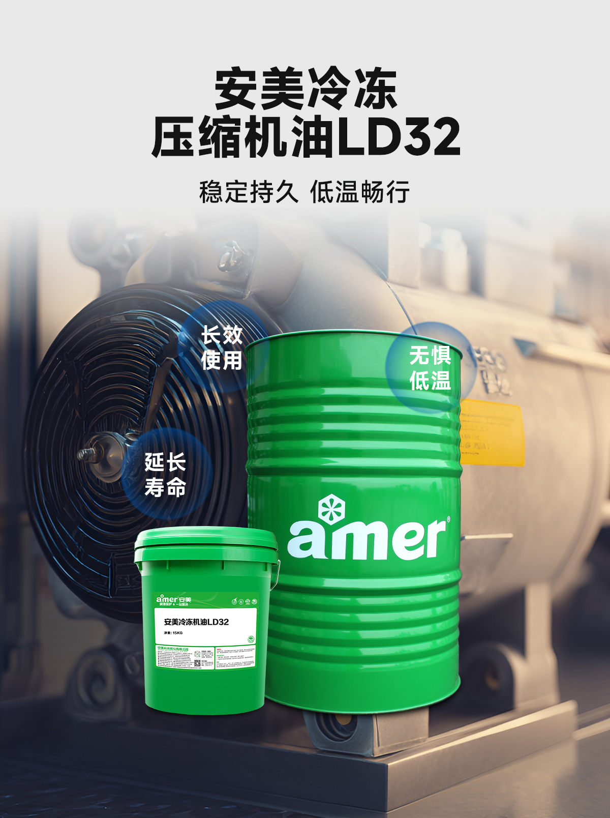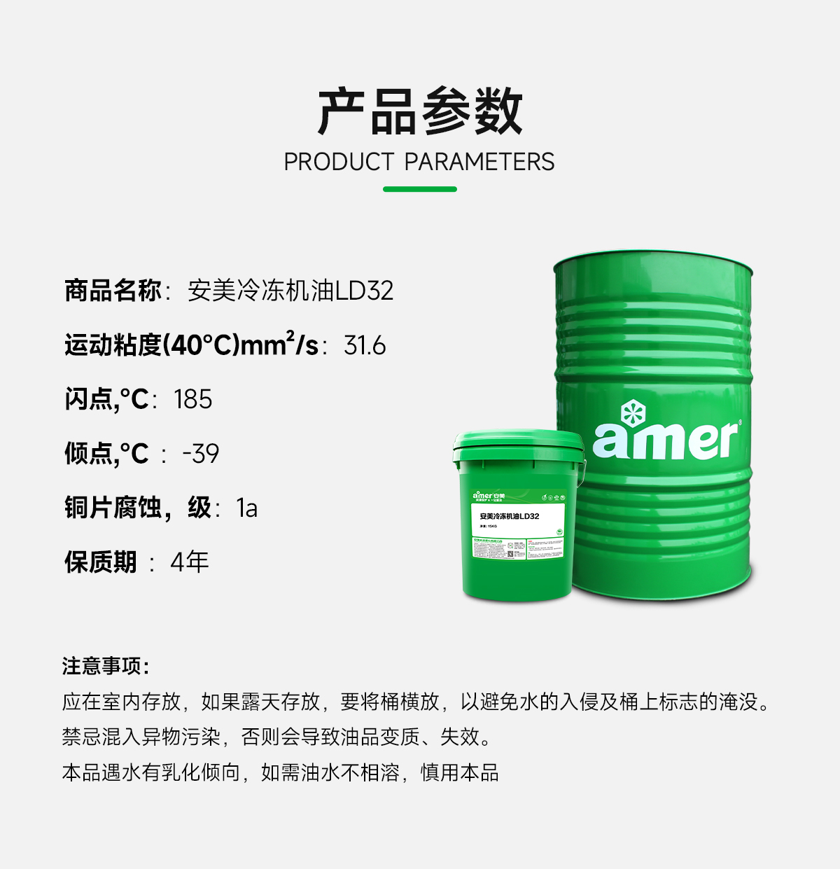 安美冷冻压缩机油LD32适用于制冷剂为 R12/R22 的冷冻冷藏、制冷、热泵、中央空调系统的螺杆式或者往复式压缩机。