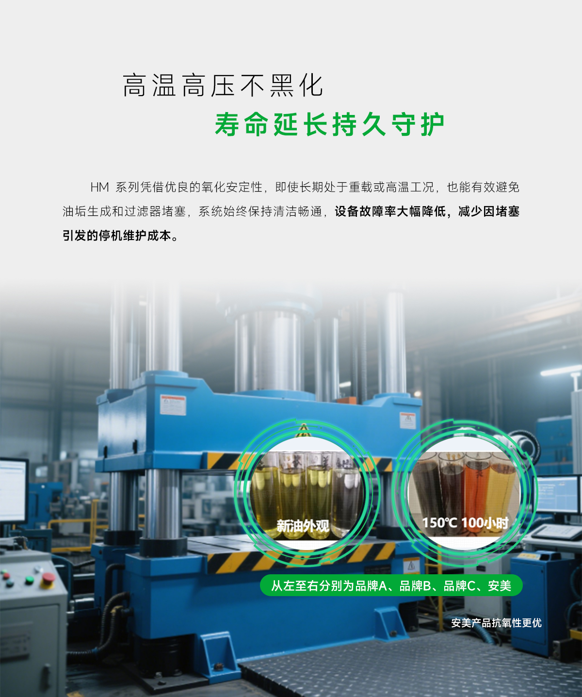 安美高压抗磨液压油HM系列产品为优质抗磨液压循环润滑油,系选用高质量异构脱腊的石蜡基矿物油和性能优良的添加剂精心调配而成。特效抗油泥形成专利技术,使其具有非同一般的洁净效果,并提供较长的使用寿命,被业界誉为洁净专家。其质量超越国际 L-HM 级质量标准。符合全球各主要液压设备制造商之质量要求。