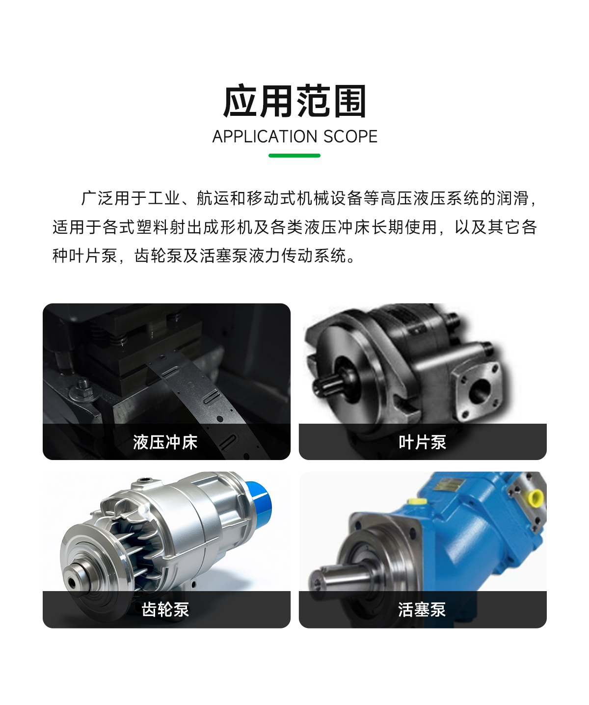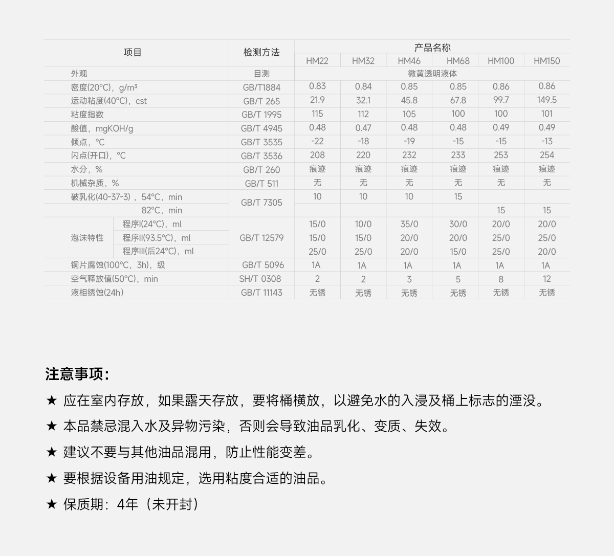 1、优异的抗乳化性:深度精制的基础油及特效添加剂配方,使得本品具有快速分离水分的特性,适用于在潮湿条件下或有可能进水的液压系统的润滑。