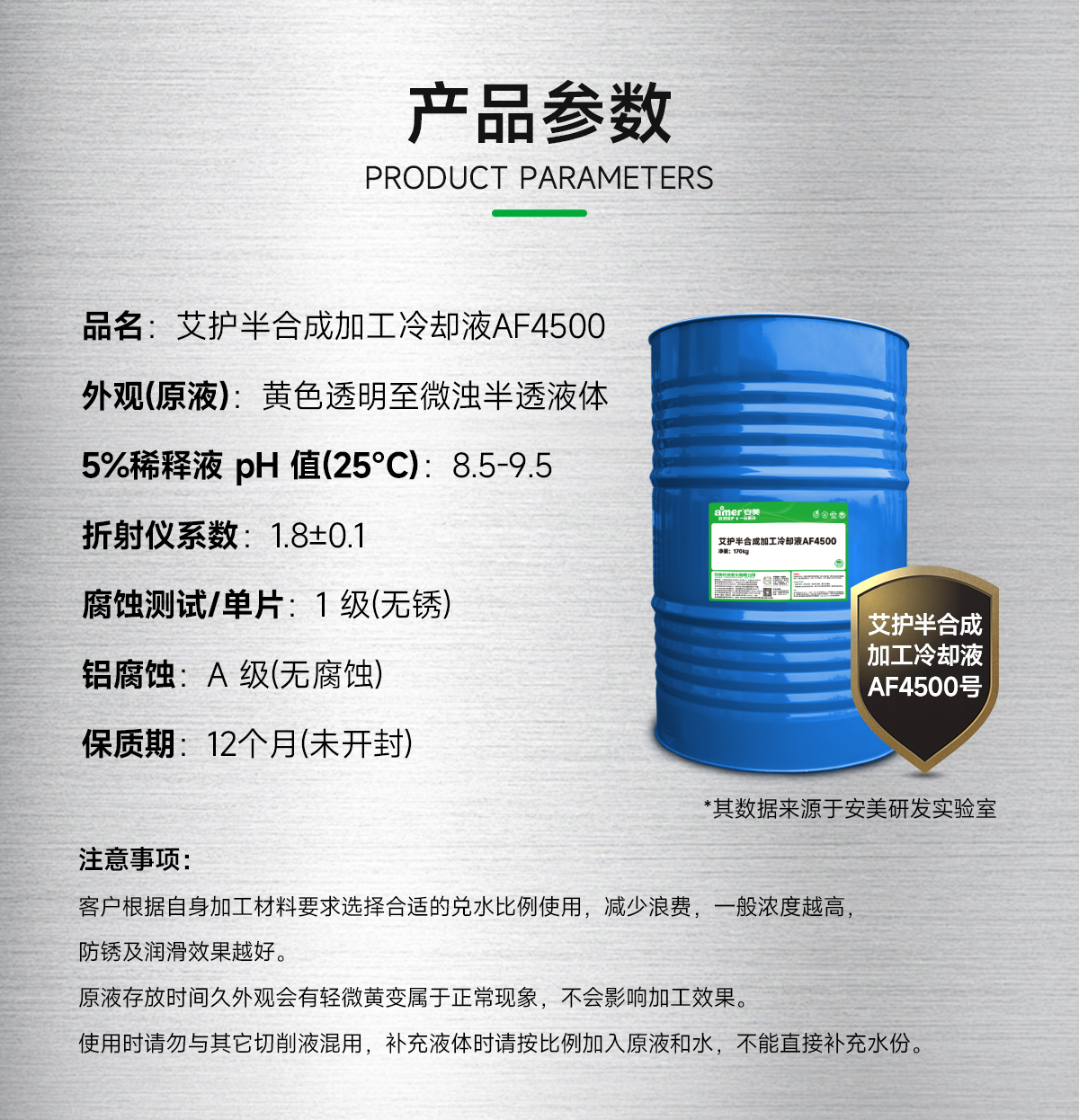 关于艾护半合成加工冷却液AF4500的其它具体指标参数,请移步”安美商城”下载MSDS和TDS报告浏览,或直接联系安美冷却液厂家客服热线400-7788-123/客服微信18576991625查询索取。