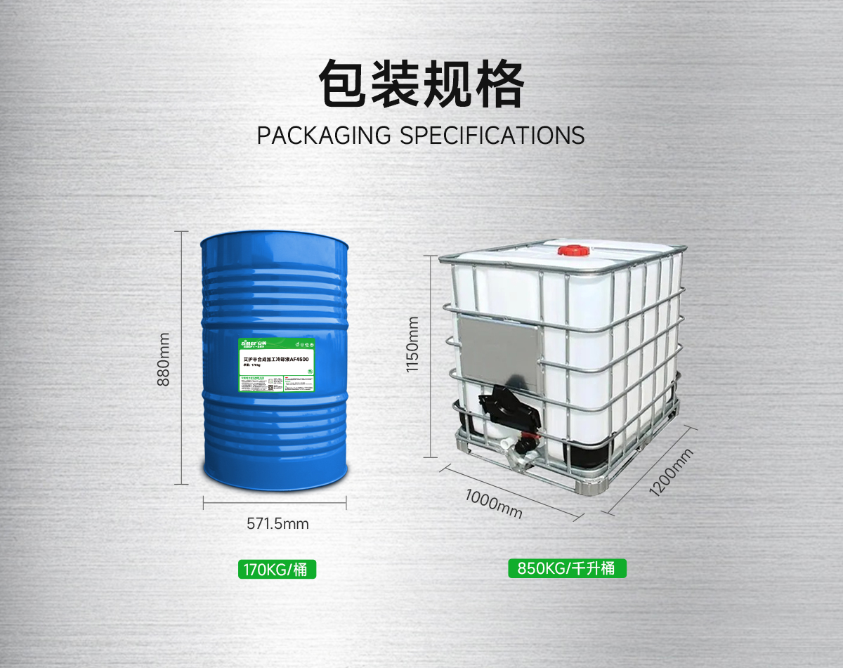 艾护半合成加工冷却液AF4500是不含卤素的半合成水溶性加工液,主要应用于黑色金属的轻至中负荷加工工艺比如切、车、钻、铣等;良好的防锈性能,即使低至 2%的浓度可通过 GB/T 6144 的防锈实验要求;同时具有良好的抗腐败性能,正常单机使用可以轻松超过 1 年的使用寿命。
