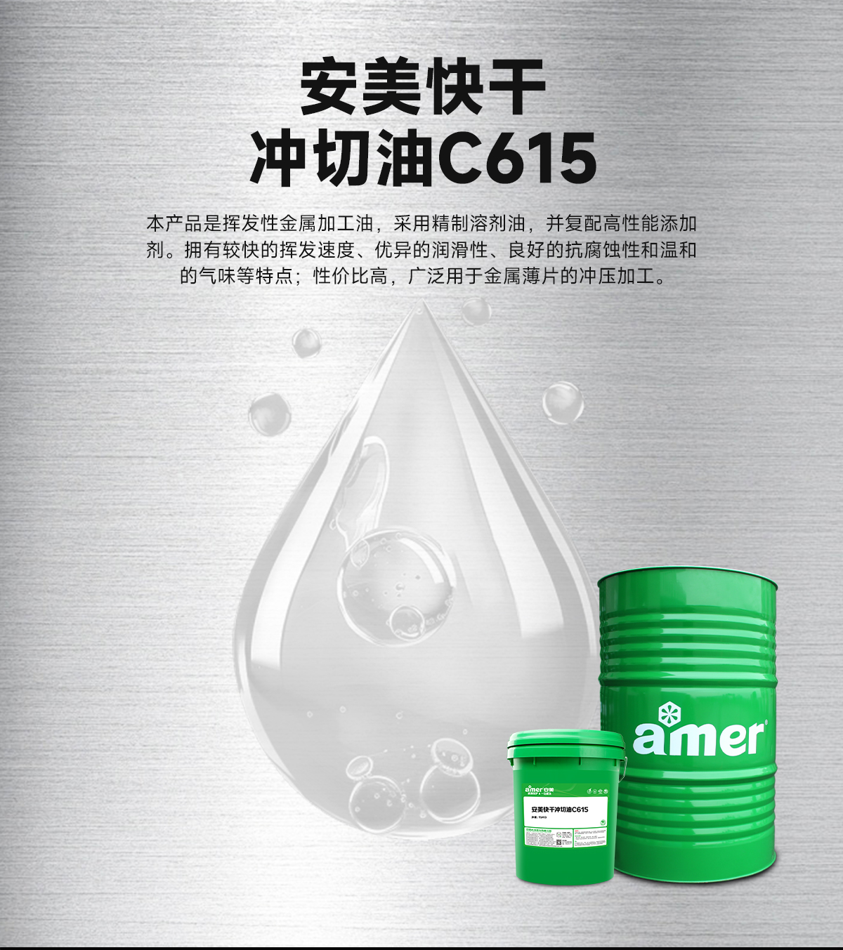 安美快干冲切油C615是挥发性金属加工油,采用精制溶剂油,并复配高性能添加剂。拥有较快的挥发速度、优异的润滑性、良好的抗腐蚀性和温和的气味等特点;性价比高,广泛用于金属薄片的冲压加工。