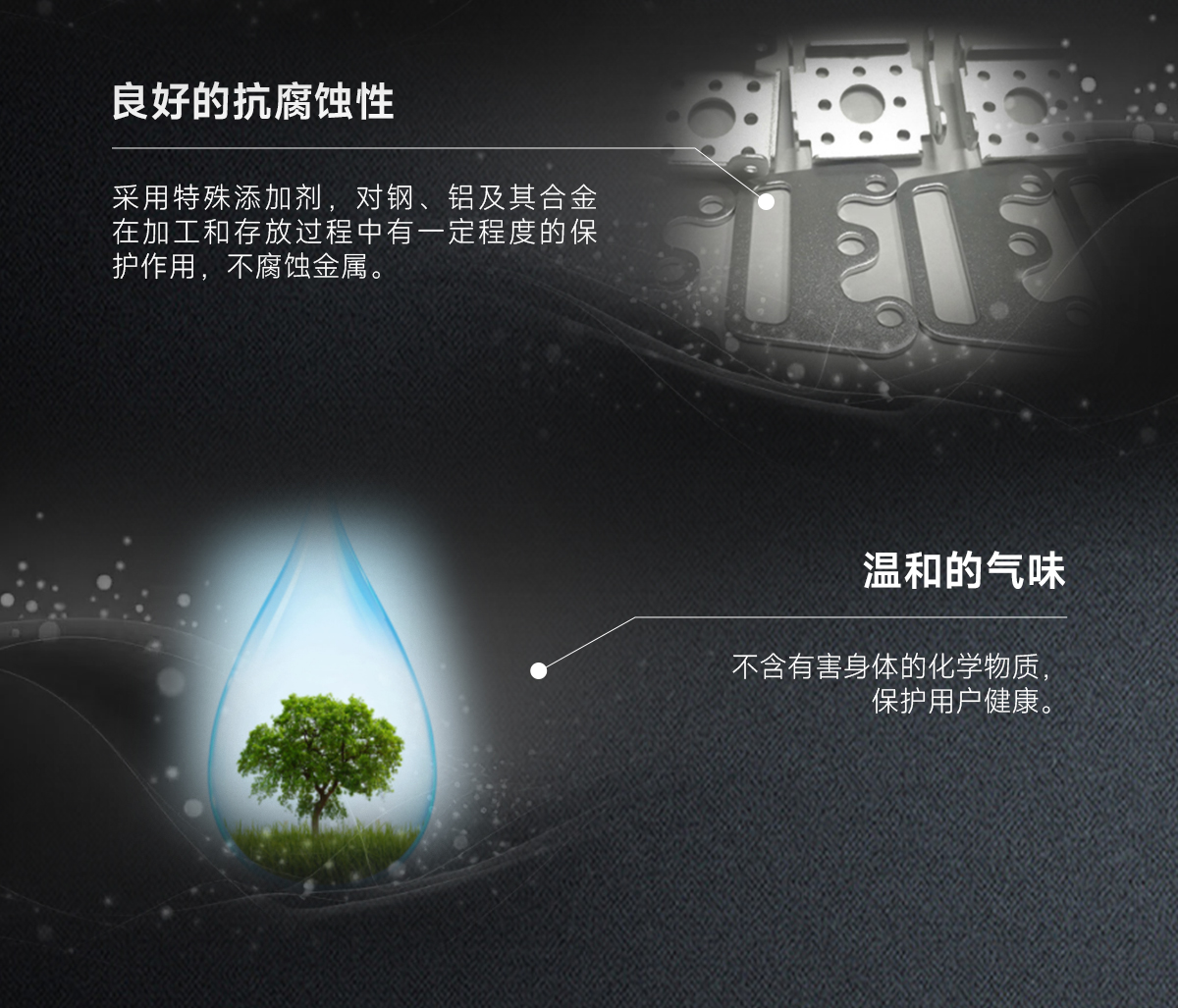 3、良好的抗腐蚀性:采用特殊添加剂,对钢、铝及其合金在加工和存放过程中有一定程度的保护作用,不腐蚀金属。