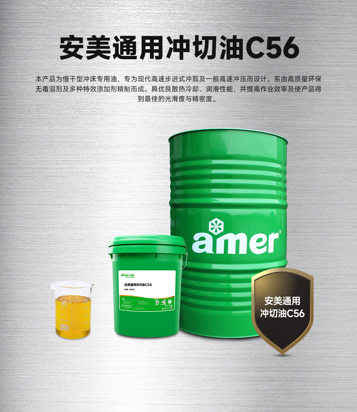 安美通用冲切油C56为慢干型冲床专用油,专为现代高速步进式冲剪及一般高速冲压而设计。系由高质量环保无毒溶剂及多种特效添加剂精制而成。具优良散热冷却、润滑性能,并提高作业效率及使产品得到最佳的光滑度与精密度。