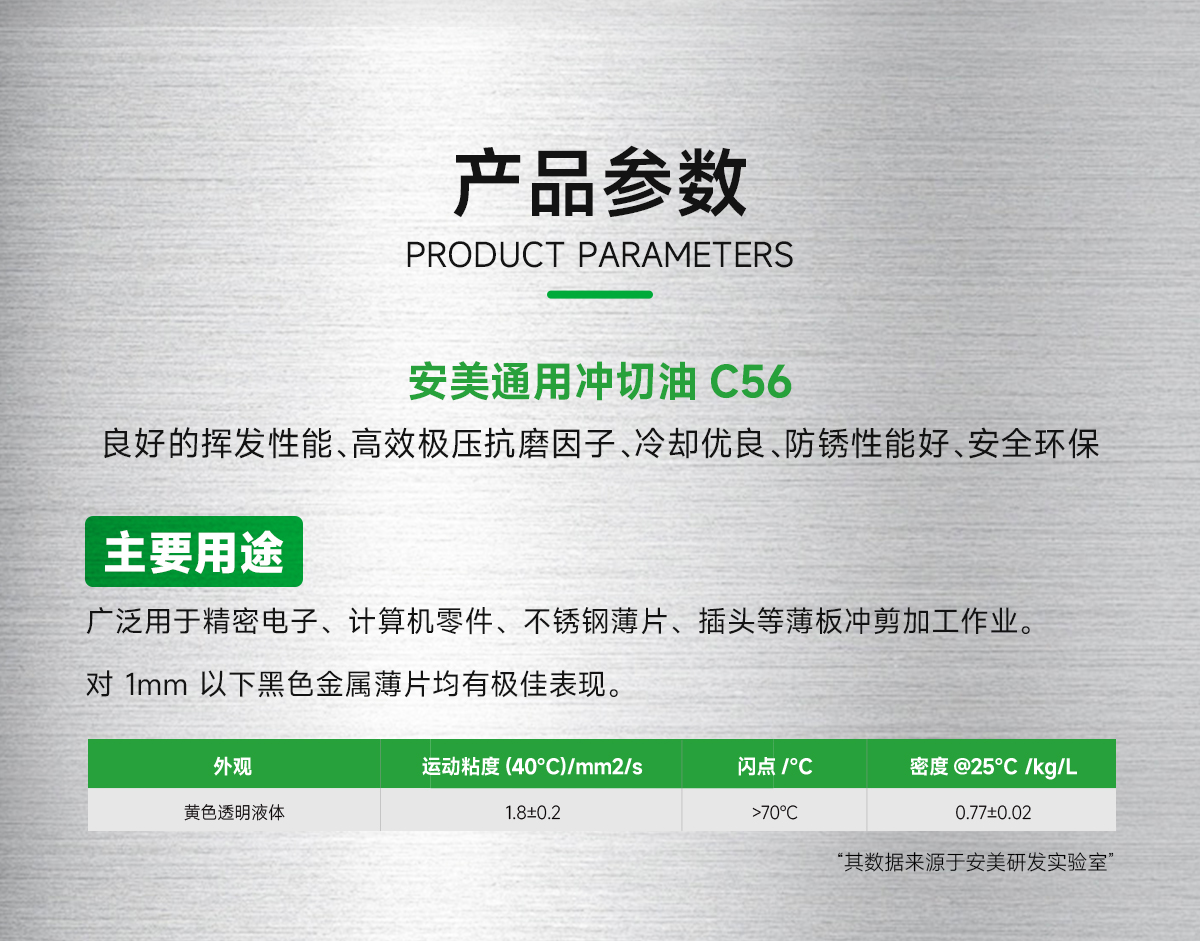 关于安美通用冲切油C56的其它具体指标参数,请移步”安美商城”下载MSDS和TDS报告浏览,或直接联系冲切油生产厂家安美集团客服热线400-7788-123/客服微信18576991625查询索取。