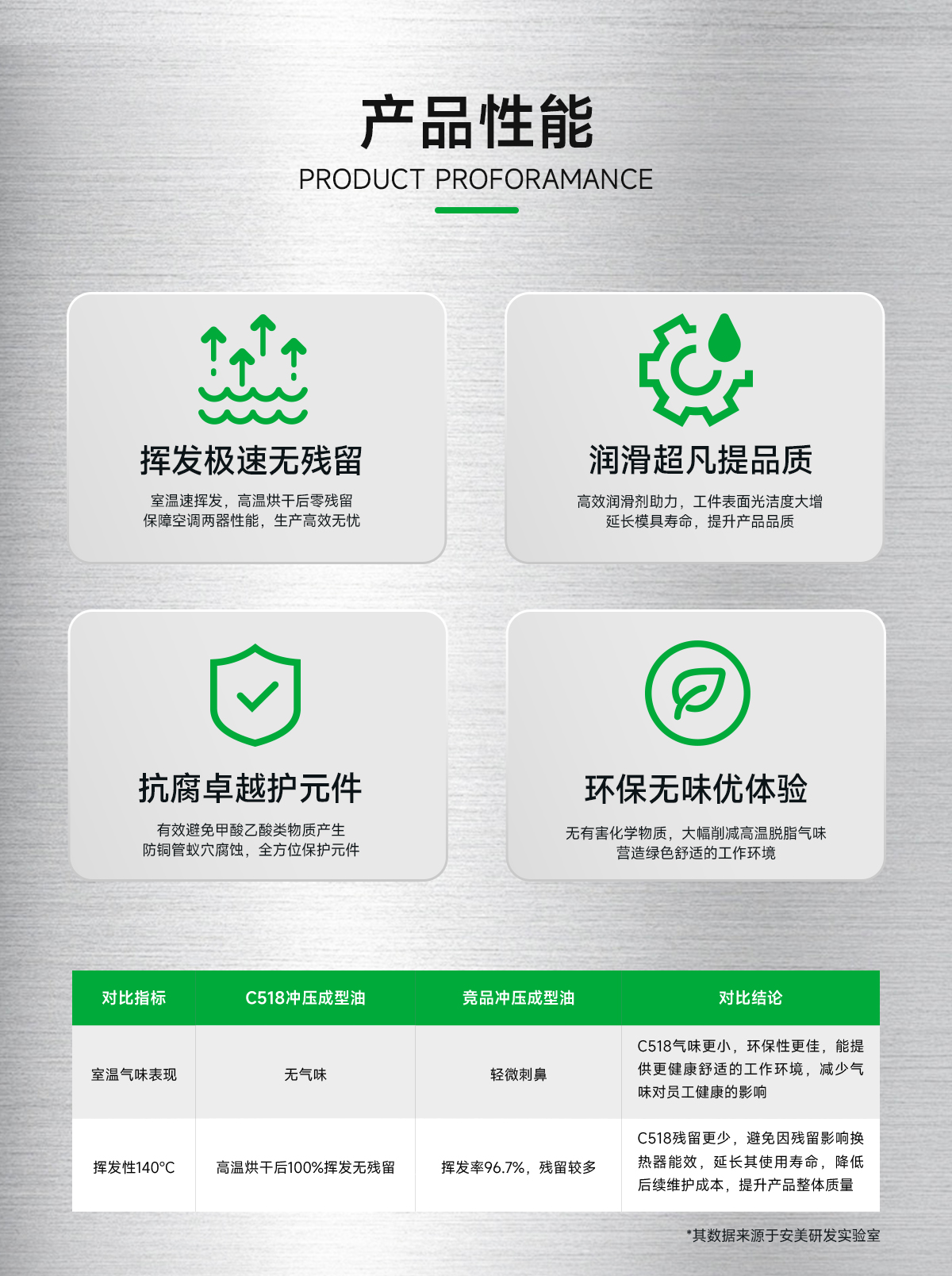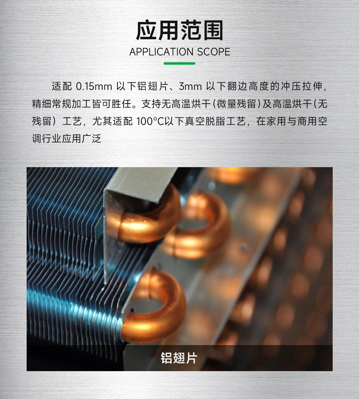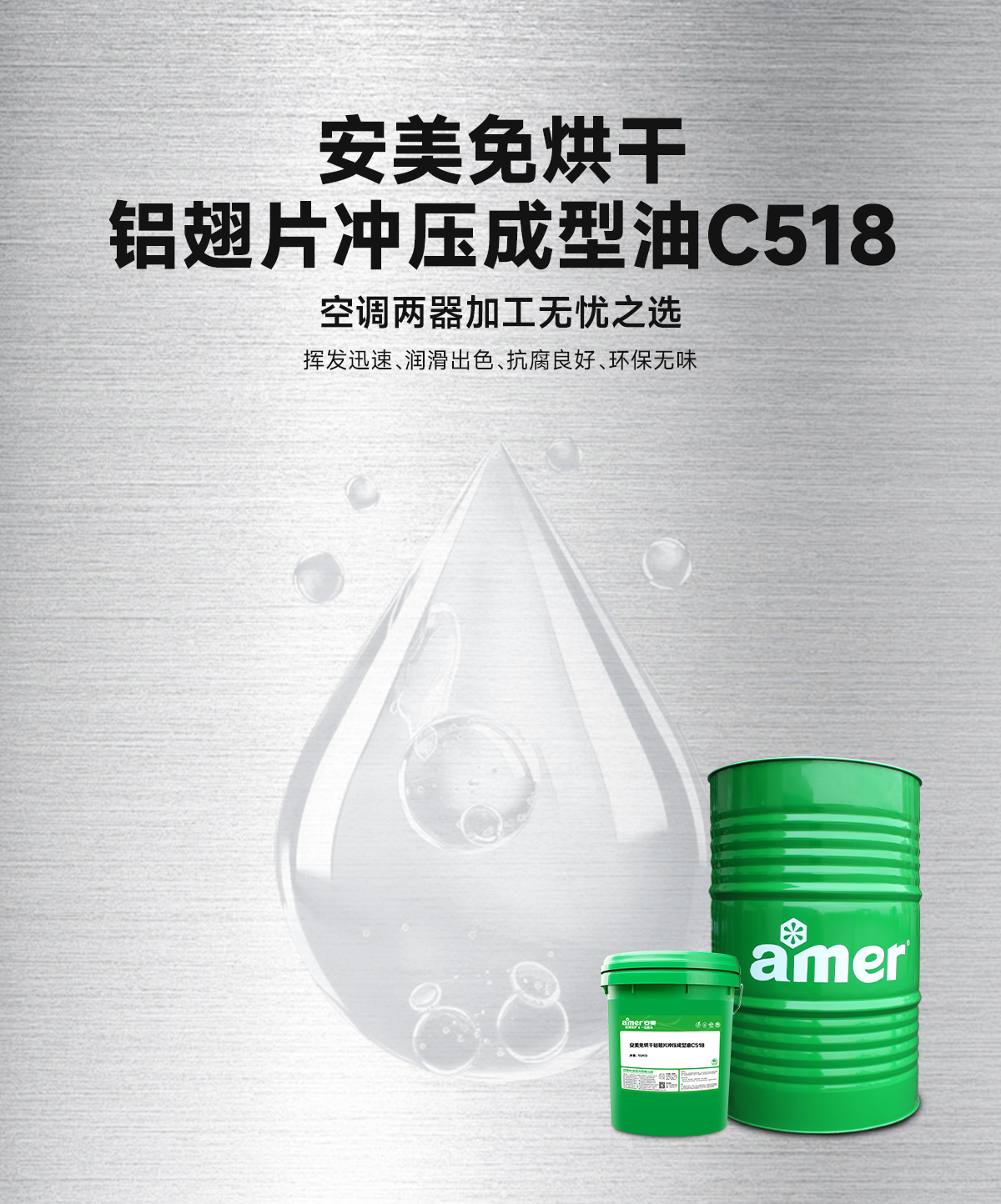 1、安美免烘干铝翅片冲压成型油C518适用于铝翅片厚度在 0.15mm 以下、翻边高度在 3mm 以下的冲压拉伸加工。