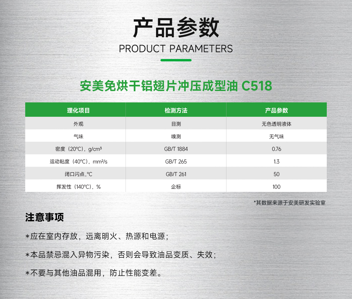 关于安美免烘干铝翅片冲压成型油C518的其它具体指标参数,请移步”安美商城”下载MSDS和TDS报告浏览,或直接金属加工油生产厂家-安美集团客服热线400-7788-123/客服微信18576991625查询索取。