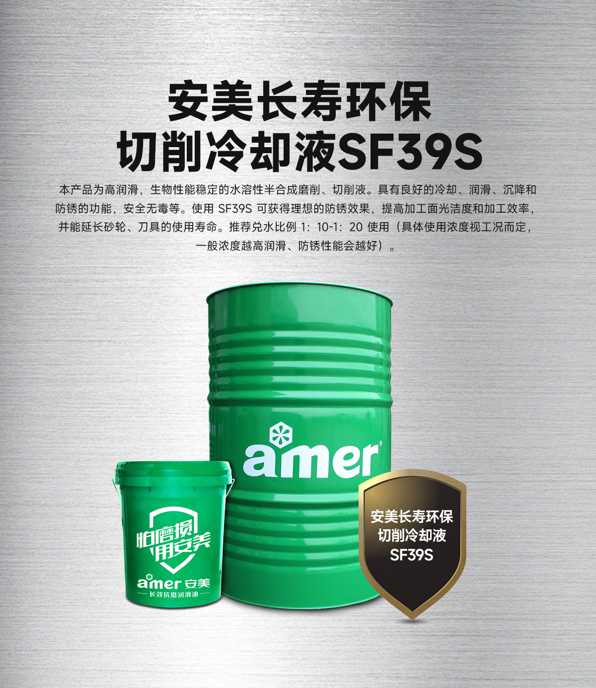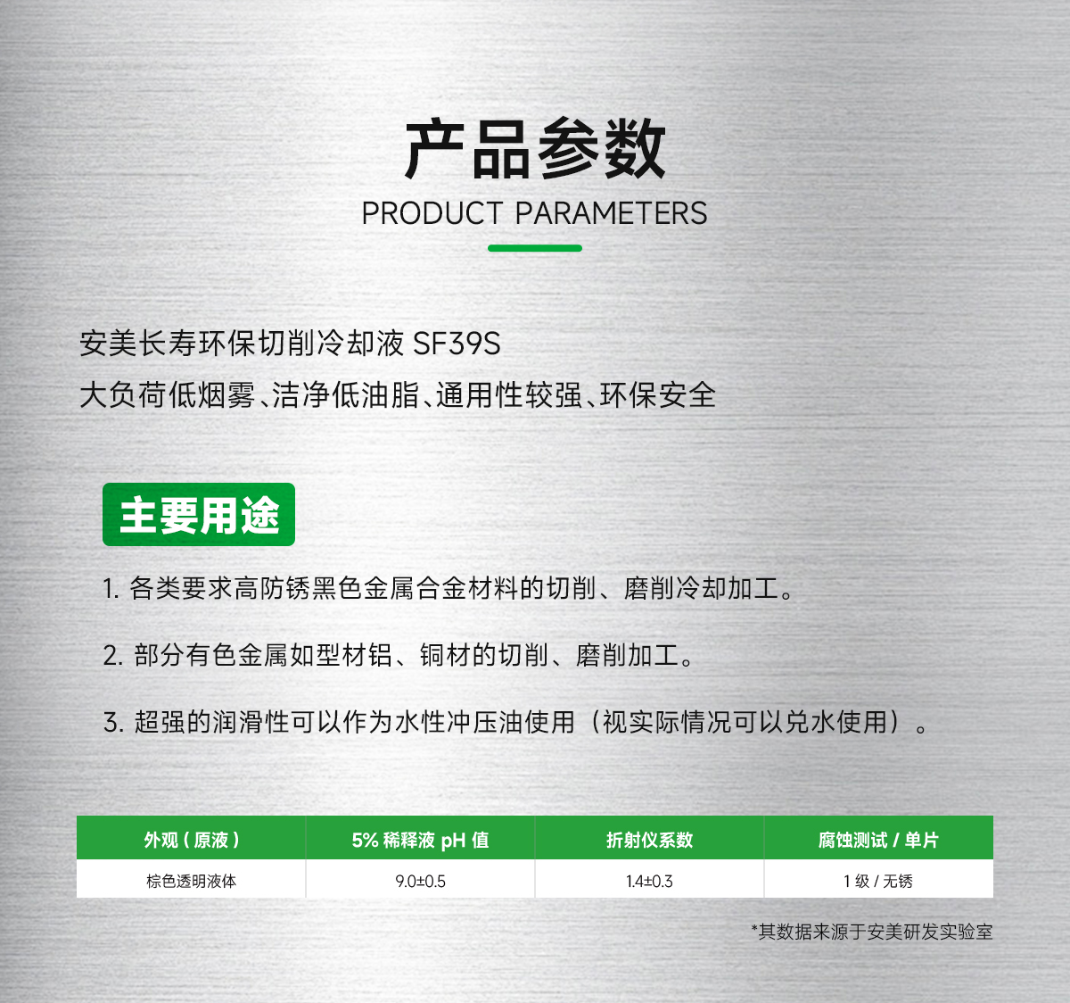 关于安美长寿环保切削冷却液SF39S的其它具体指标参数,请移步”安美商城”下载MSDS和TDS报告浏览,或直接切削液生产厂家-安美集团客服热线400-7788-123/客服微信18576991625查询索取。