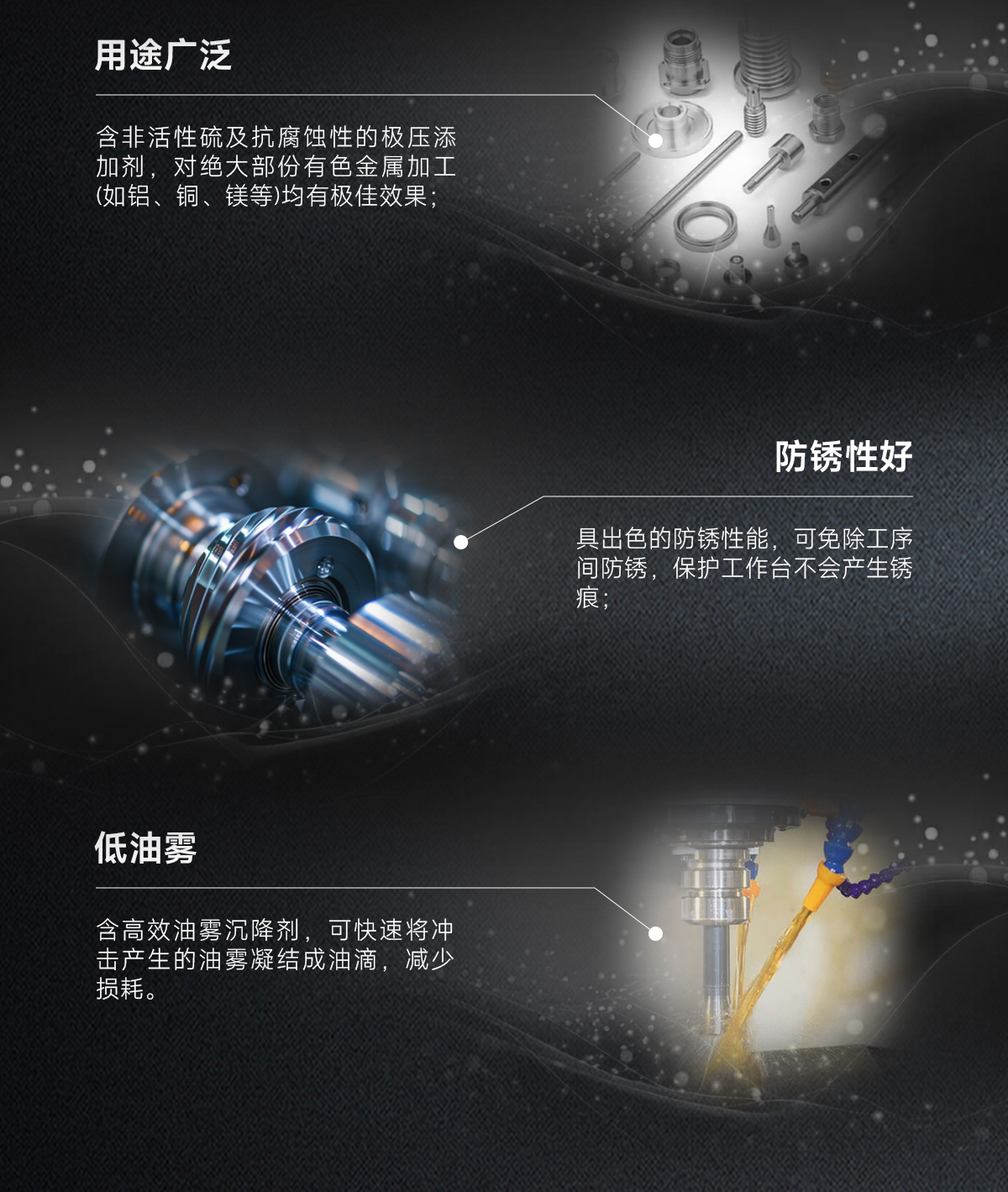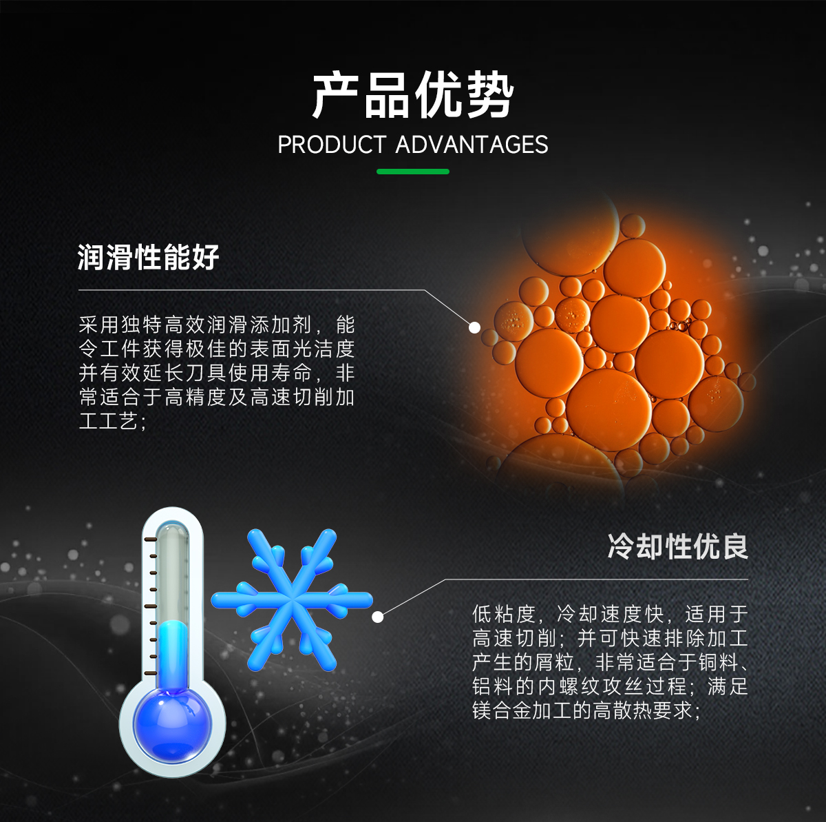 1、润滑性能好:采用独特高效润滑添加剂,能令工件获得极佳的表面光洁度并有效延长刀具使用寿命,非常适合于高精度及高速切削加工工艺;