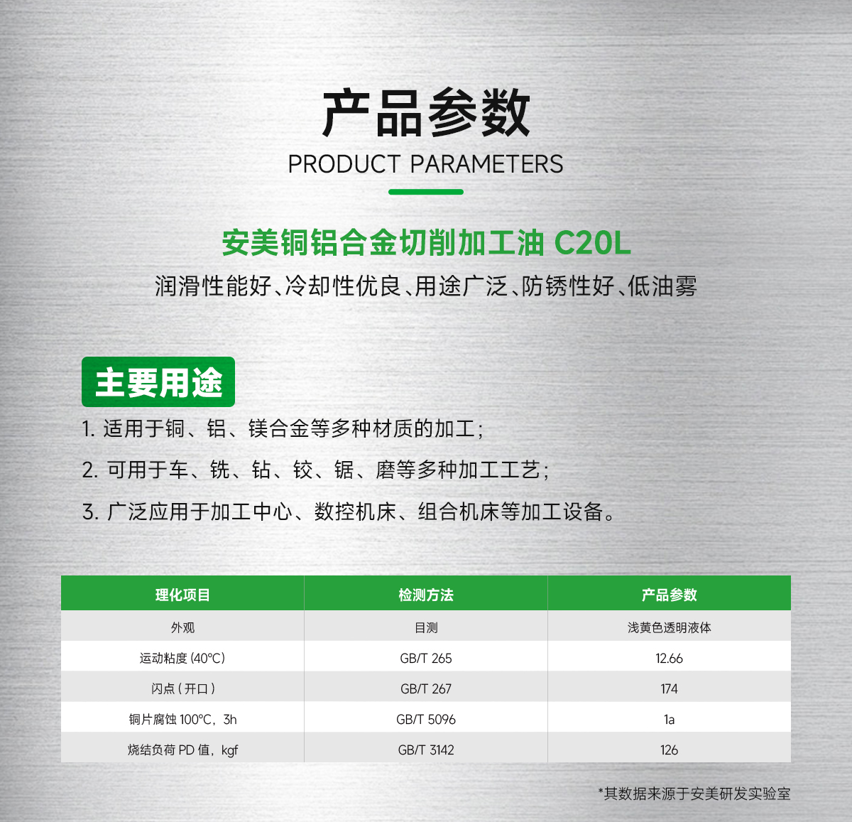 关于安美铜铝合金切削加工油C20L的其它具体指标参数,请移步”安美商城”下载MSDS和TDS报告浏览,或直接联系切削油生产厂家安美集团客服热线400-7788-123/客服微信18576991625查询索取。