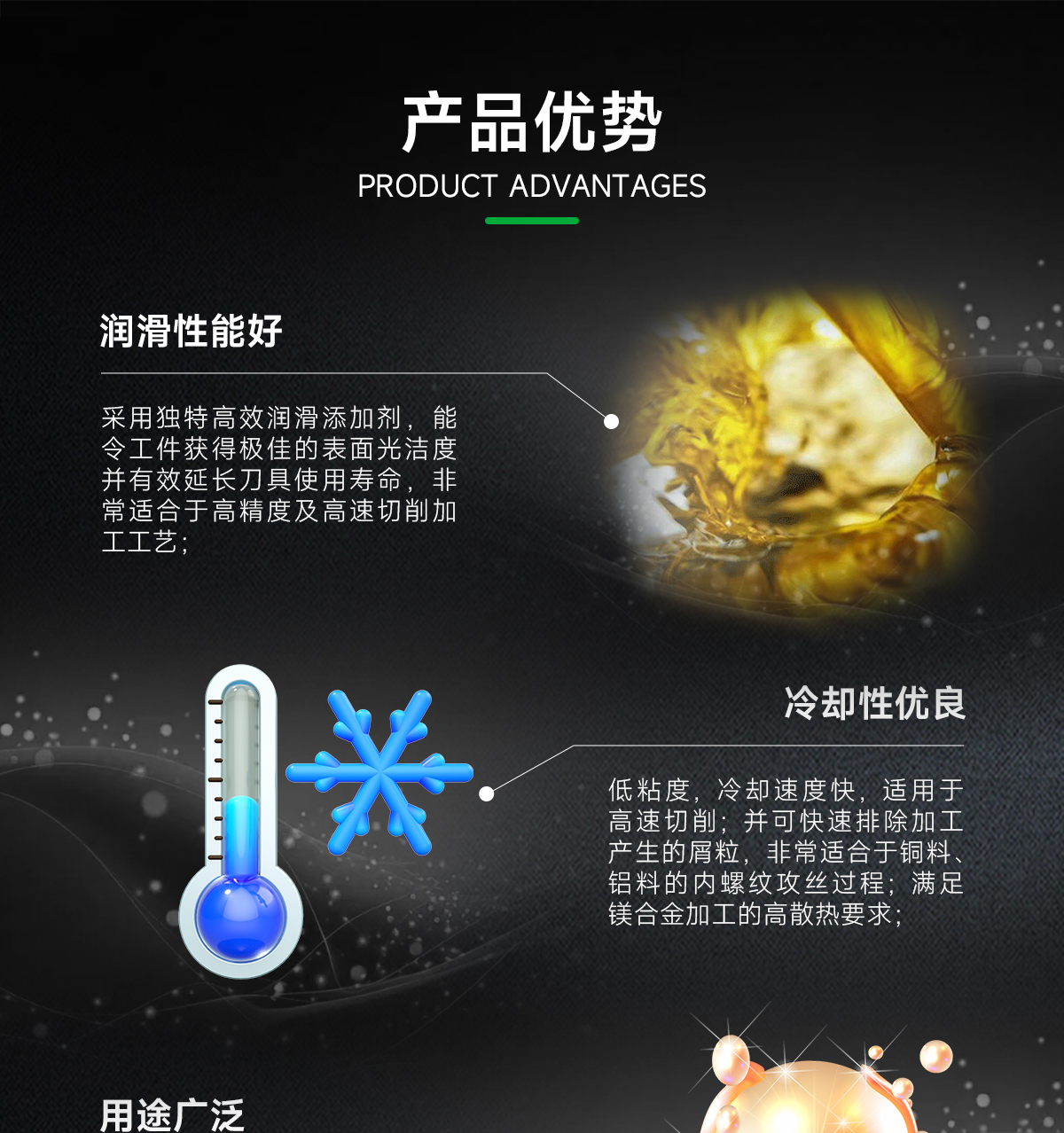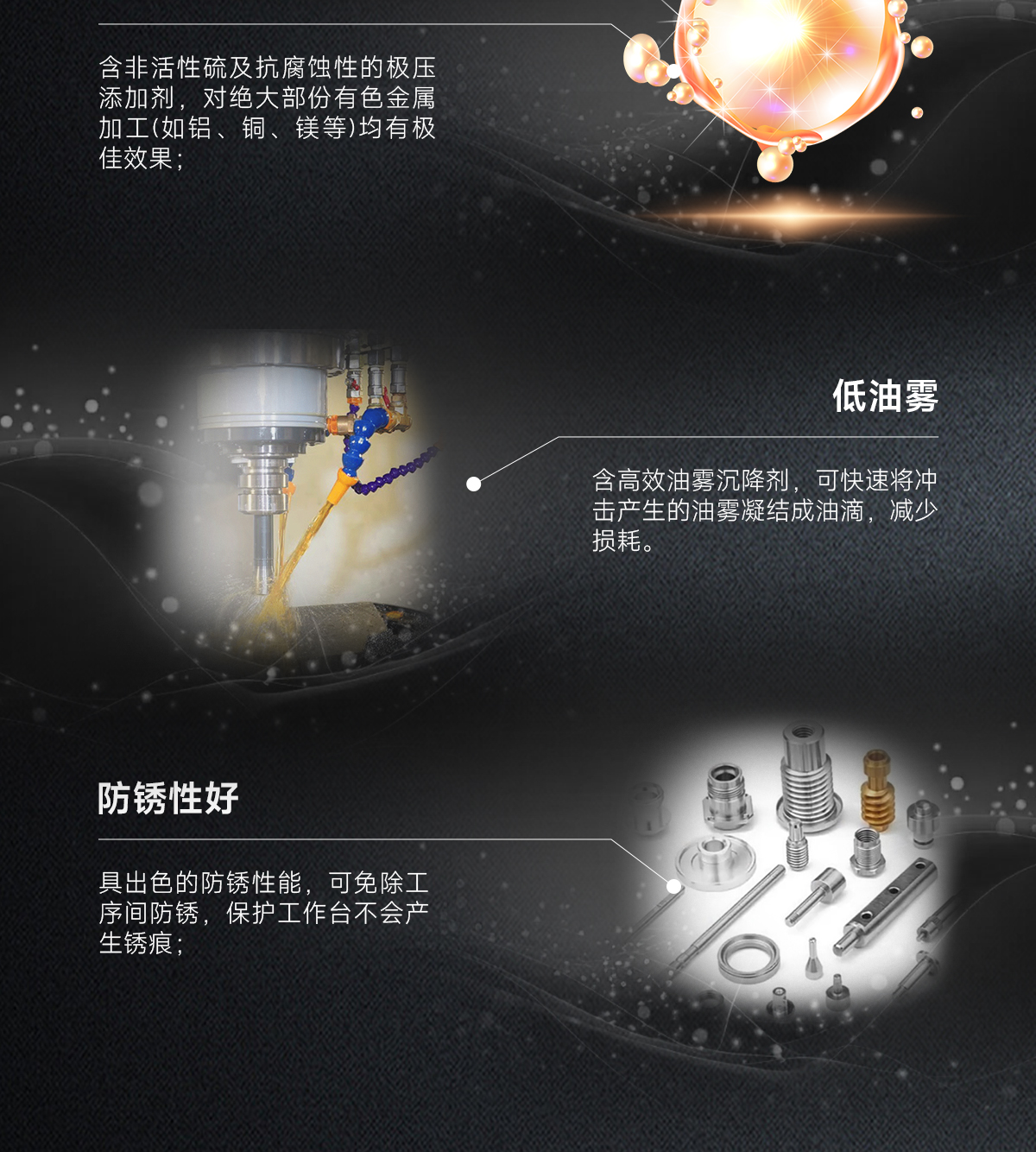 1、润滑性能好:采用独特高效润滑添加剂,能令工件获得极佳的表面光洁度并有效延长刀具使用寿命,非常适合于高精度及高速切削加工工艺;