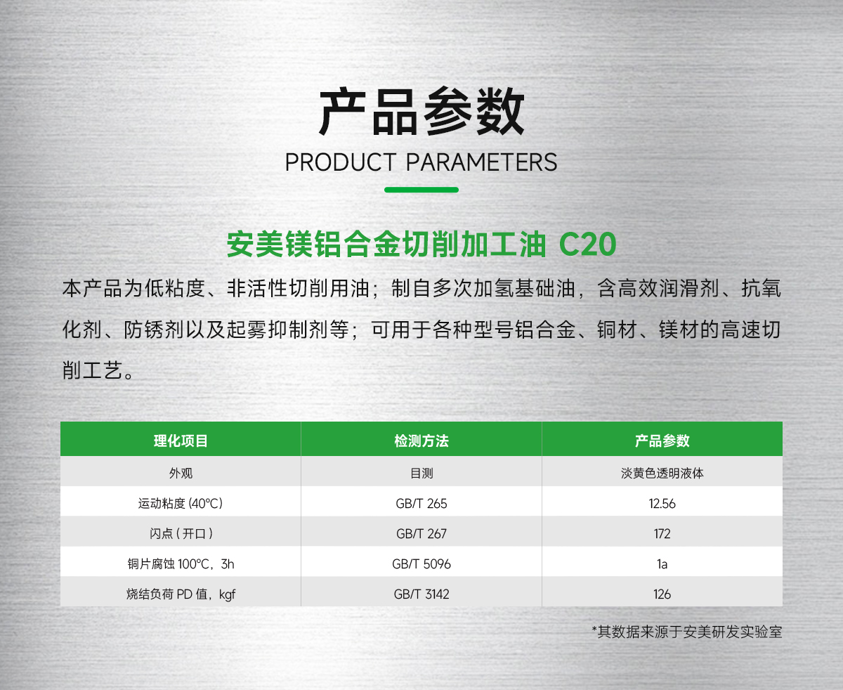 关于安美镁铝合金切削加工油C20的其它具体指标参数,请移步”安美商城”下载MSDS和TDS报告浏览,或直接切削油生产厂家-安美集团客服热线400-7788-123/客服微信18576991625查询索取。