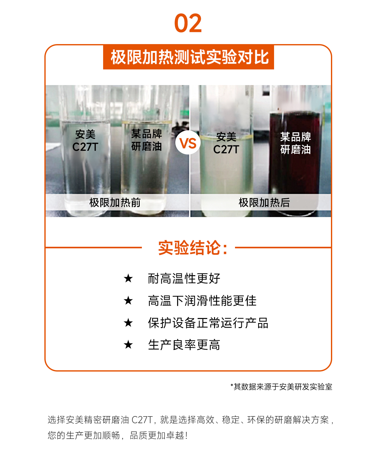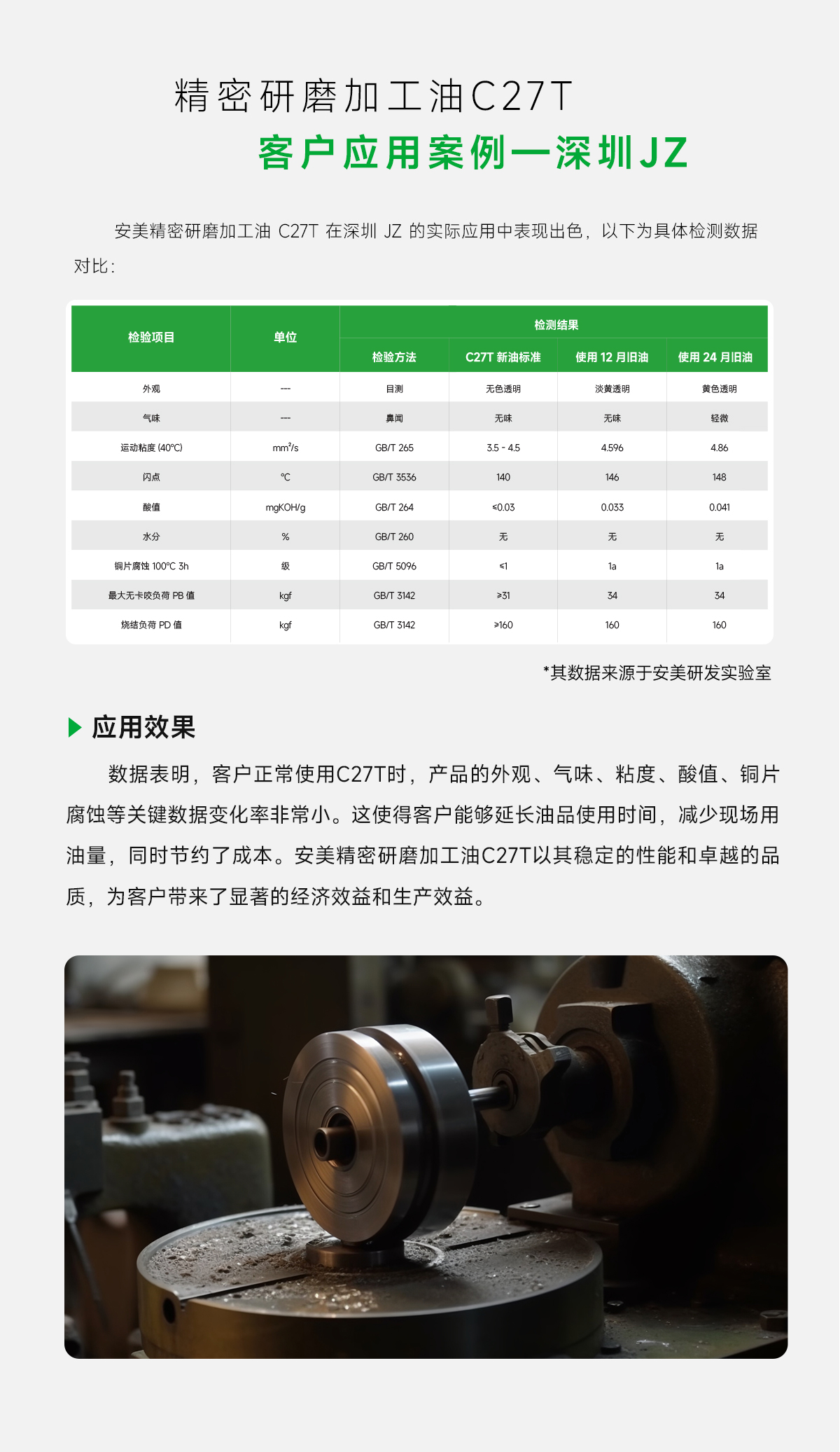 关于安美精磨研磨加工油C27T的其它具体指标参数,请移步”安美商城”下载MSDS和TDS报告浏览,或直接研磨加工油生产厂家-安美集团客服热线400-7788-123/客服微信18576991625查询索取。
