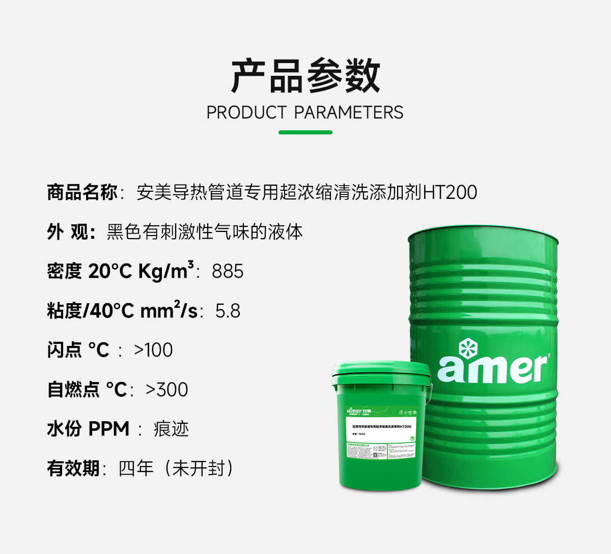 关于安美导热管道专用超浓缩清洗添加剂HT200的其它具体指标参数,请移步”安美商城”下载MSDS和TDS报告浏览,或直接联系工业清洗剂厂家安美集团客服热线400-7788-123/客服微信18576991625查询索取。