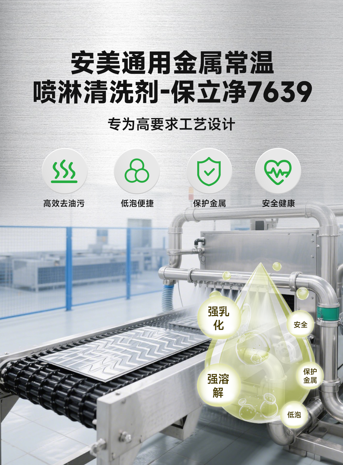 1、安美通用金属常温喷淋清洗剂-保立净7639广泛应用于铝、碳钢、不锈钢、合金钢等金属的除油喷淋清洗工序。