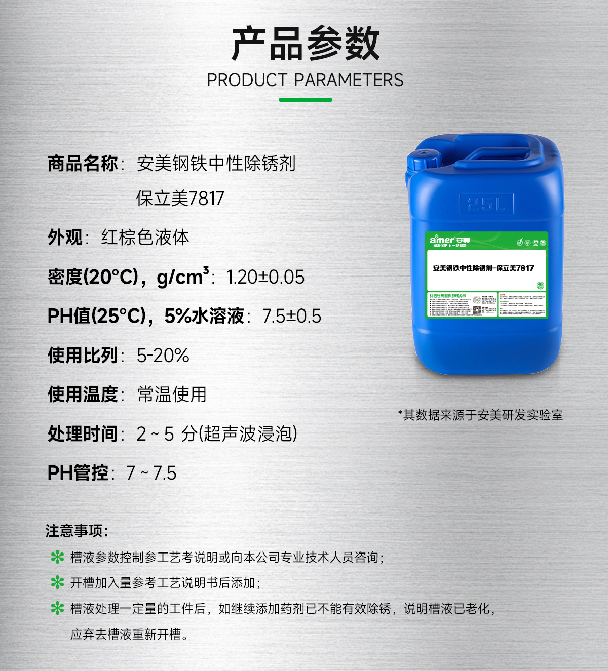 关于安美医疗器械钢铁中性除锈剂-保立美7817的其它具体指标参数,请移步”安美商城”下载MSDS和TDS报告浏览,或直接除锈剂生产厂家—安美集团客服热线400-7788-123/客服微信18576991625查询索取。