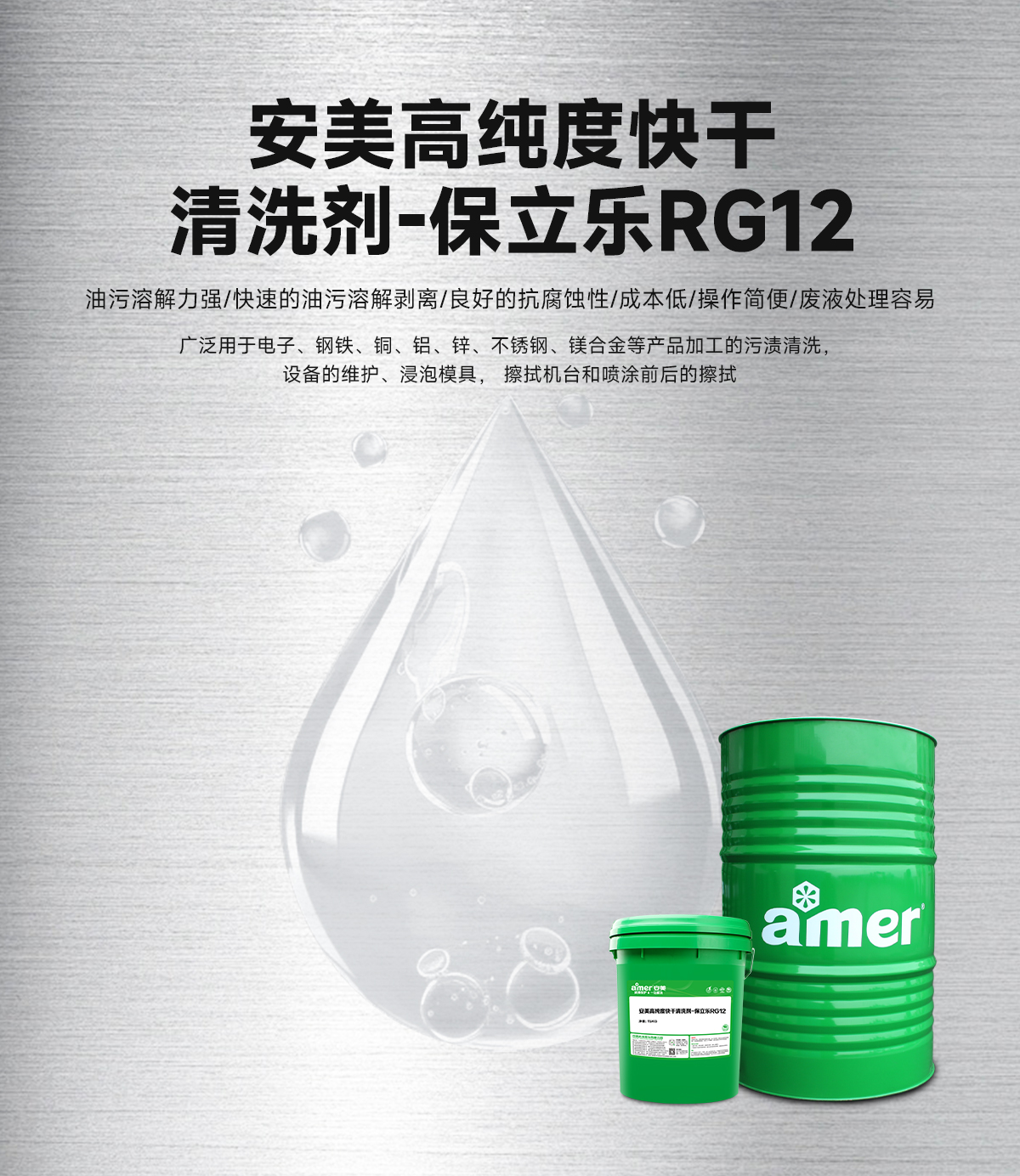安美高纯度快干清洗剂-保立乐RG12广泛用于电子、钢铁、铜、铝、锌、不锈钢、镁合金等产品加工的污渍清洗,设备的维护、浸泡模具,擦拭机台和喷涂前后的擦拭