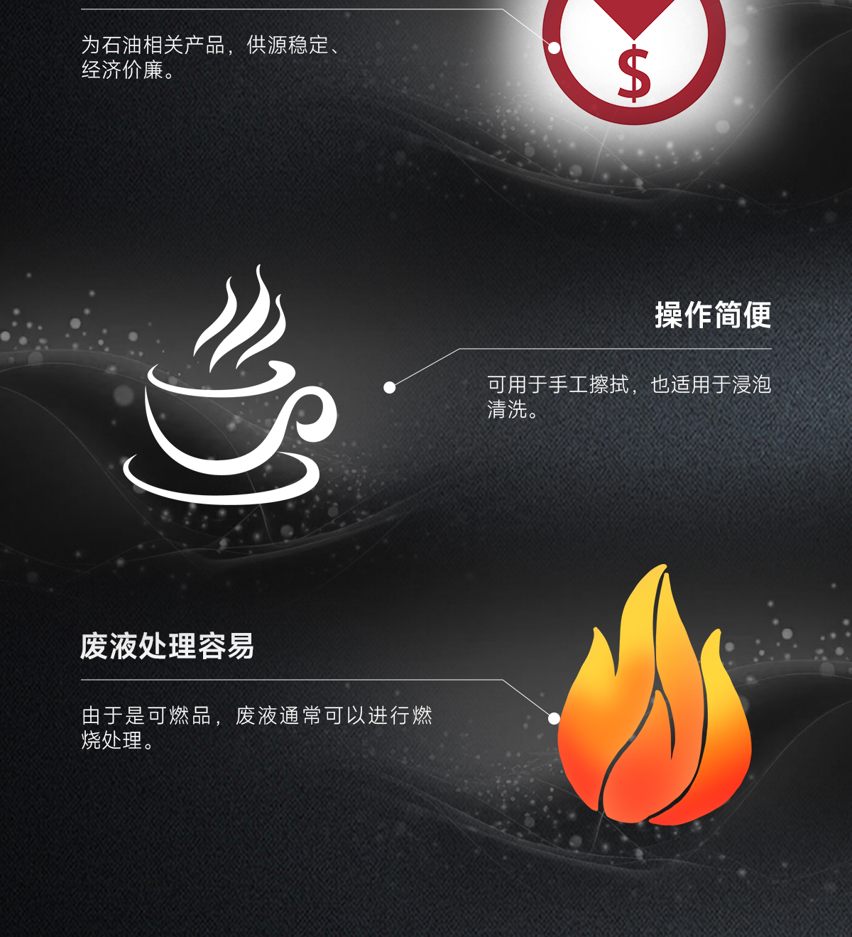 1、对油污溶解力强---低导电性,非极性溶剂,对于非极性油污类均具特别的亲和力,溶解迅速;