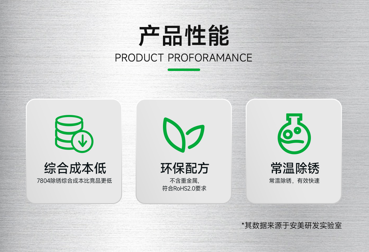 关于安美常温酸性除锈剂-保立美7804的其它具体指标参数,请移步”安美商城”下载MSDS和TDS报告浏览,或直接除锈剂生产厂家—安美集团客服热线400-7788-123/客服微信18576991625查询索取。