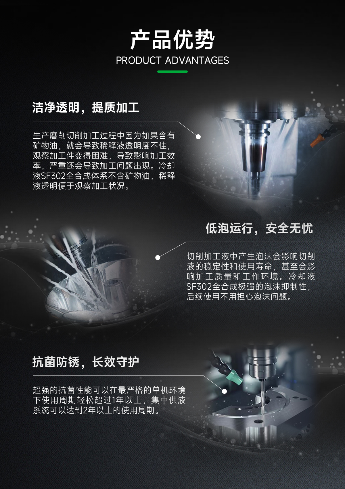 1、全合成体系不含矿物油,稀释液透明便于观察加工状况。