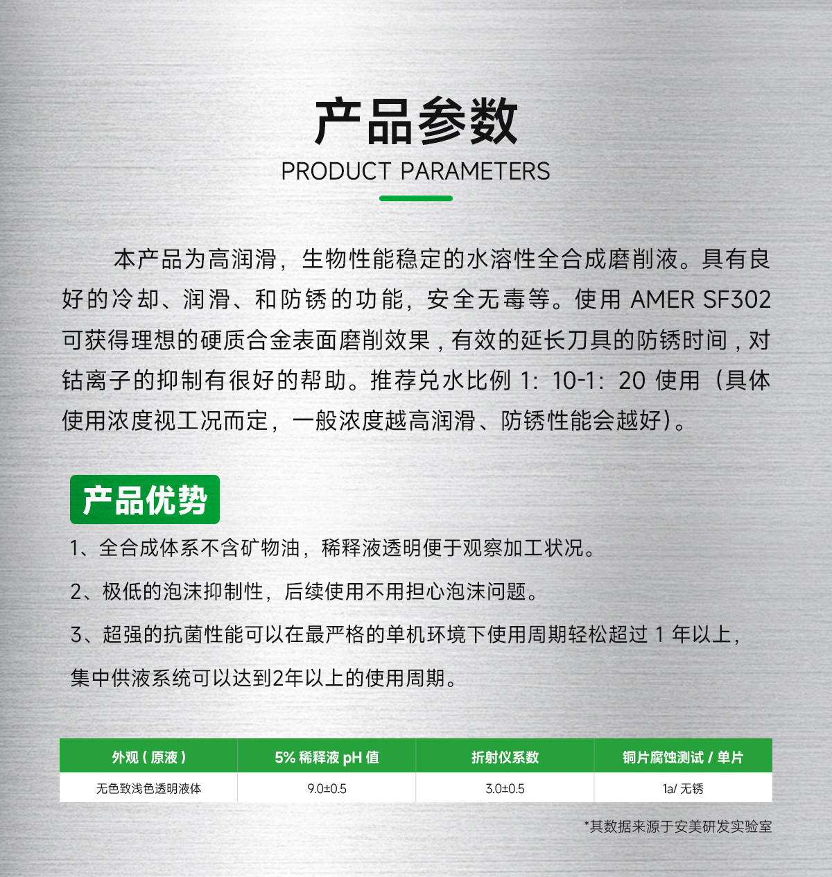 安美氢化三联苯合成热载体DR350本产品为高润滑,生物性能稳定的水溶性全合成磨削液。具有良好的冷却、润滑、和防锈的功能,安全无毒等。使用 AMER SF302 可获得理想的硬质合金表面磨削效果,有效的延长刀具的防锈时间,对钴离子的抑制有很好的帮助。推荐兑水比例 1:10-1:20 使用(具体使用浓度视工况而定,一般浓度越高润滑、防锈性能会越好)。