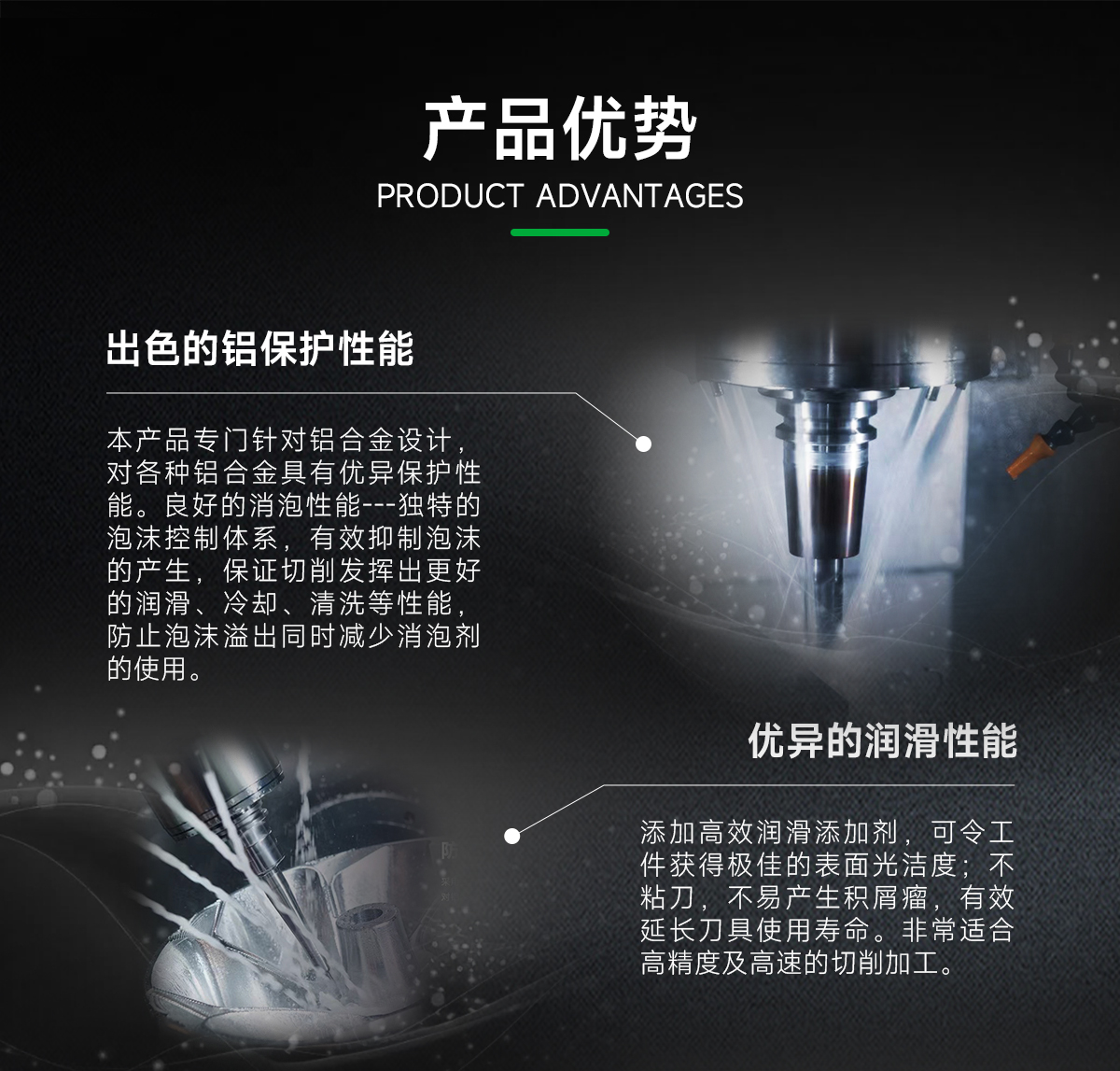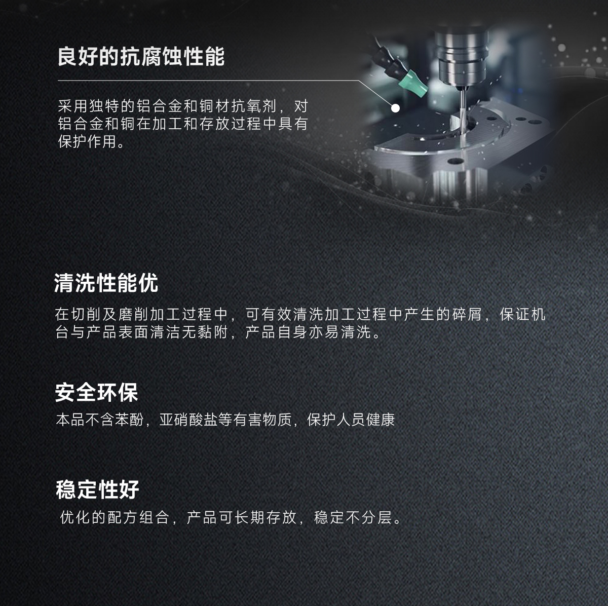 5、清洗性能优:在切削及磨削加工过程中,可有效清洗加工过程中产生的碎屑,保证机台与产品表面清洁无黏附,产品自身亦易清洗。