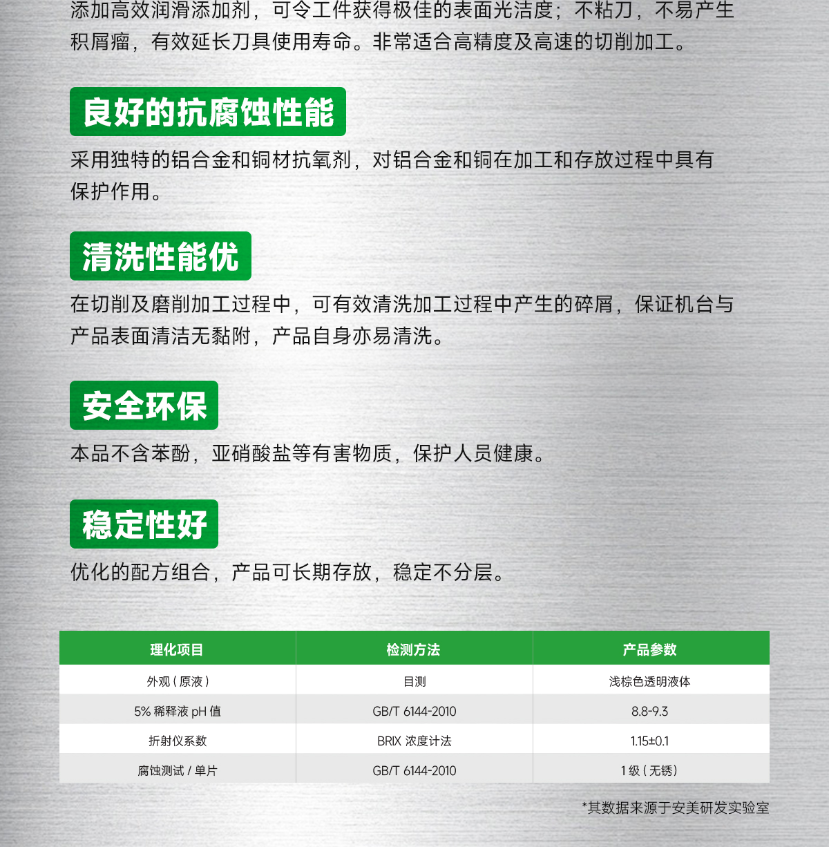 关于安美环保型切削冷却液SF328-J的其它具体指标参数,请移步”安美商城”下载MSDS和TDS报告浏览,或直接联系安美官网客服热线400-7788-123/客服微信18576991625查询索取。