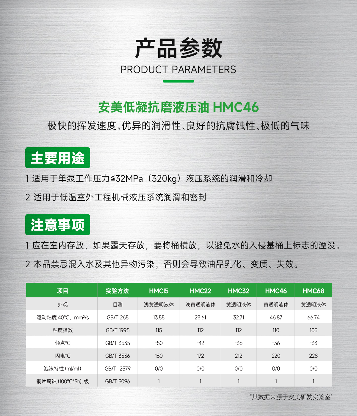 关于安美低凝抗磨液压油HMC46的其它具体指标参数,请移步”安美商城”下载MSDS和TDS报告浏览,或直接联系液压油生产厂家安美集团客服热线400-7788-123/客服微信18576991625查询索取。