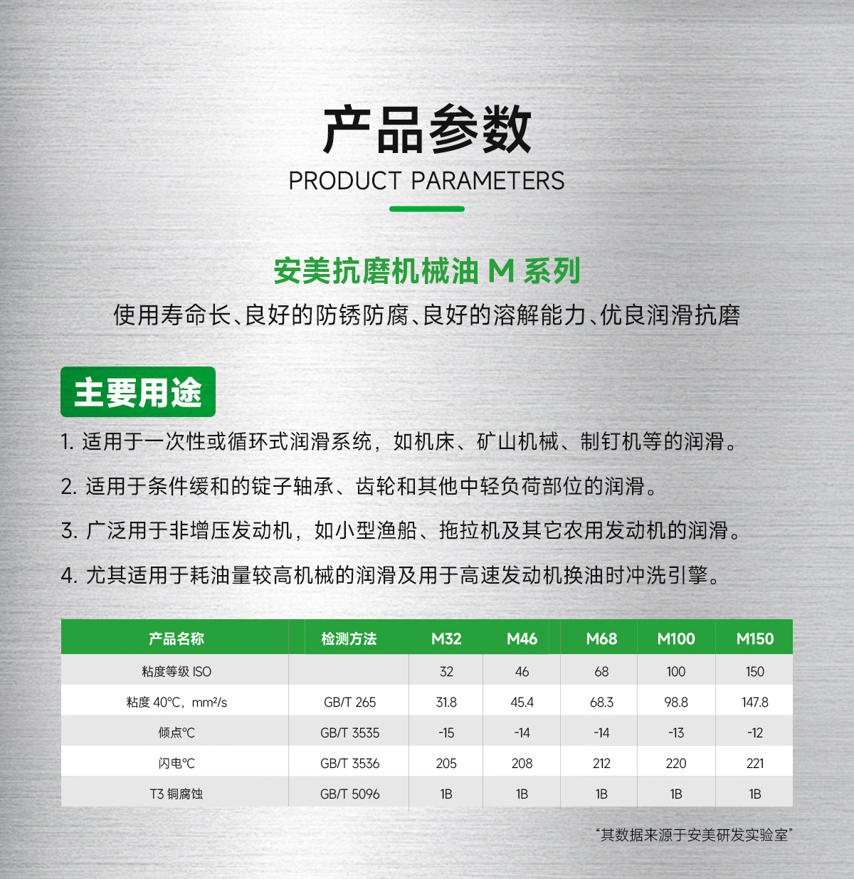 关于安美抗磨机械油M46的其它具体指标参数,请移步”安美商城”下载MSDS和TDS报告浏览,或直接联系机械油生产厂家安美集团客服热线400-7788-123/客服微信18576991625查询索取。