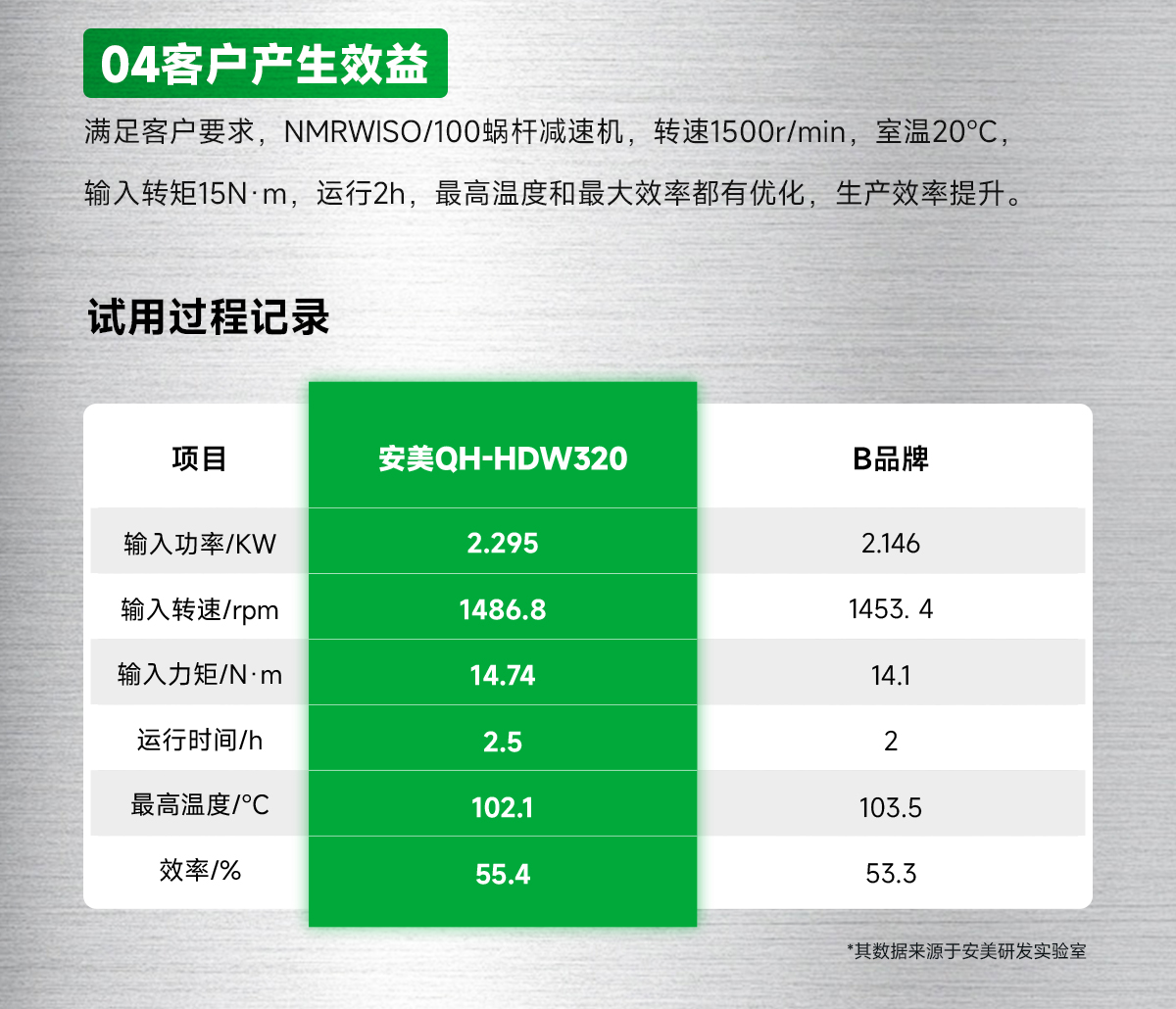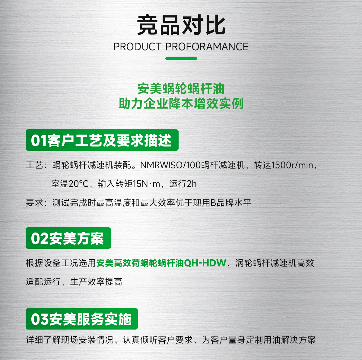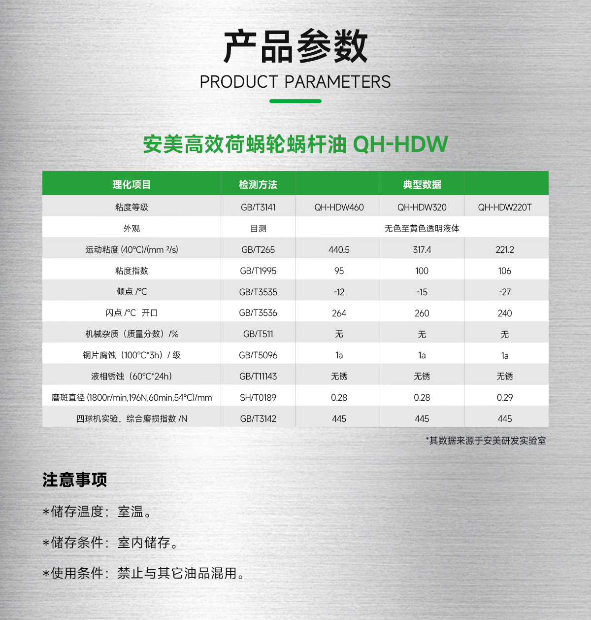 关于安美高效荷蜗轮蜗杆油QH-HDW的其它具体指标参数,请移步”安美商城”下载MSDS和TDS报告浏览,或直接蜗轮蜗杆油生产厂家安美集团客服热线400-7788-123/客服微信18576991625查询索取。