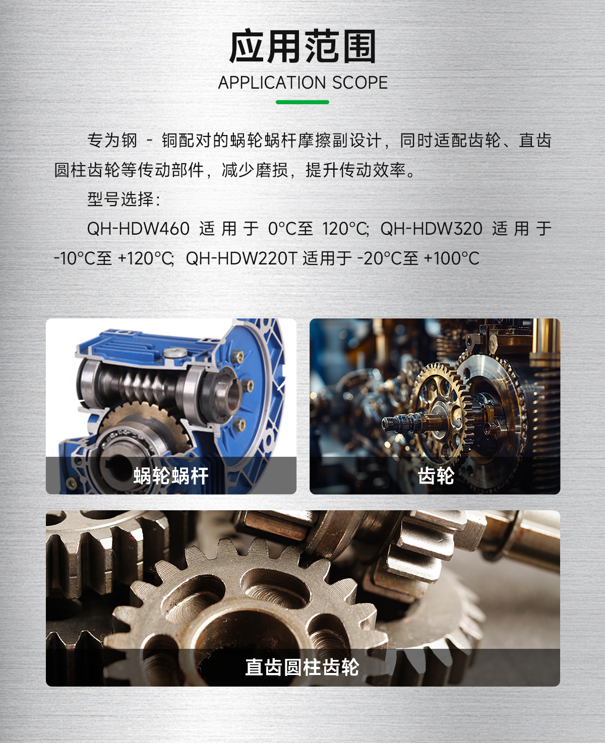 1、安美高效荷蜗轮蜗杆油QH-HDW主要适用于钢-铜配对的蜗轮蜗杆摩擦副,包括该设备的齿轮和直齿圆柱齿轮等部件的润滑。