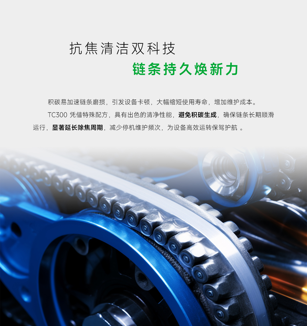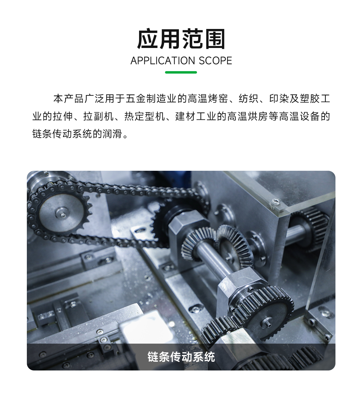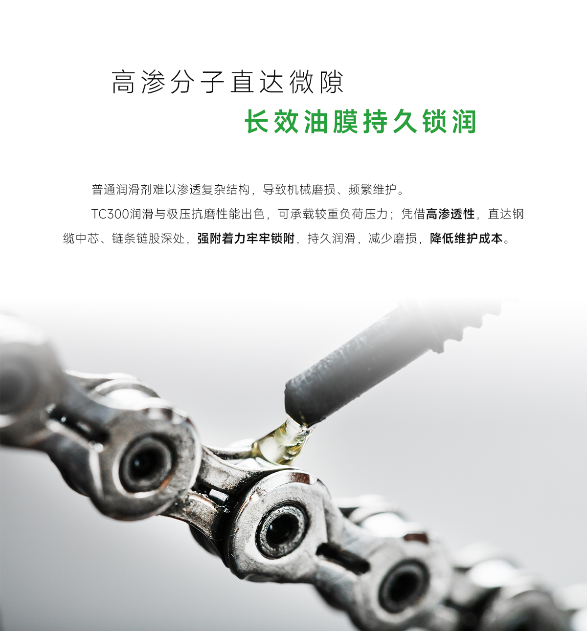 1、给链条全面保护:润滑、抗磨损性突出,可承受较重负荷,使链条有最长使用寿命;