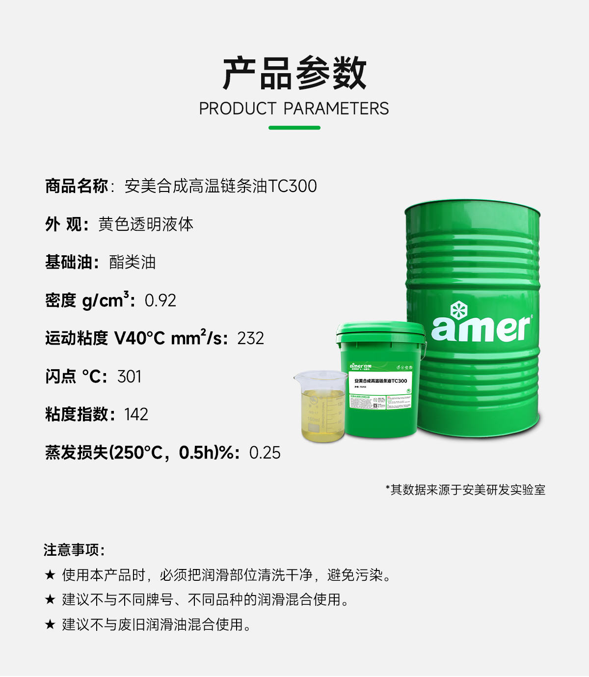 关于安美合成高温链条油TC300的其它具体指标参数,请移步”安美商城”下载MSDS和TDS报告浏览,或直接链条油生产厂家-安美集团客服热线400-7788-123/客服微信18576991625查询索取。