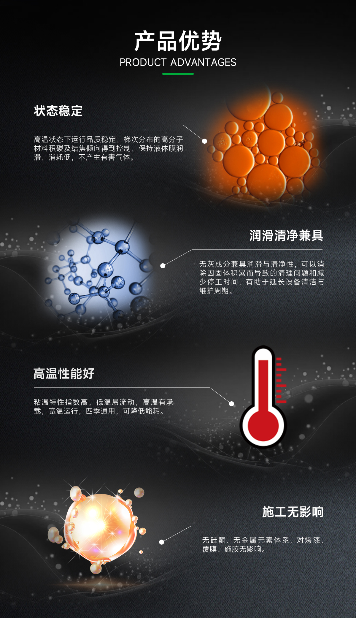 1、高温状态下运行品质稳定,梯次分布的高分子材料积碳及结焦倾向得到控制,保持液体膜润滑,消耗低,不产生有害气体。