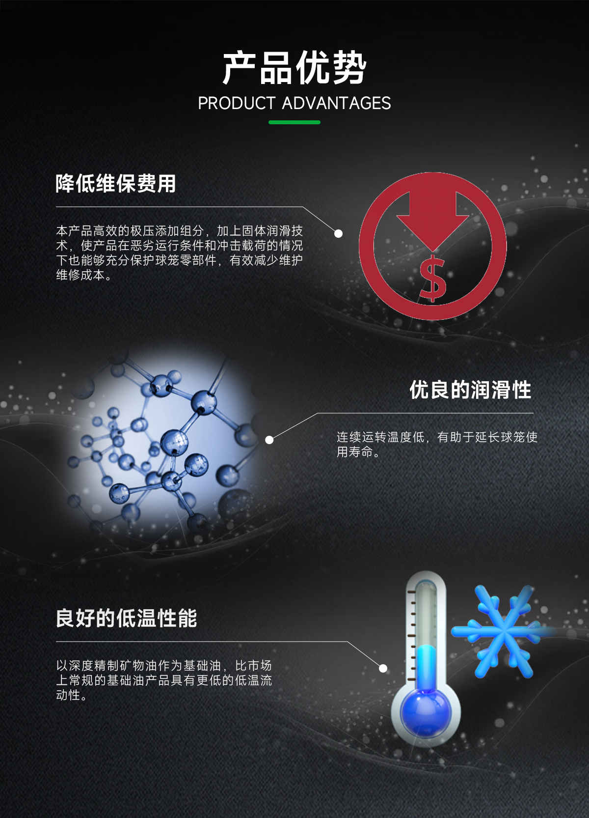 1、降低维保费用:本产品高效的极压添加组分,加上固体润滑技术,使产品在恶劣运行条件和冲击载荷的情况下也能够充分保护球笼零部件,有效减少维护维修成本。