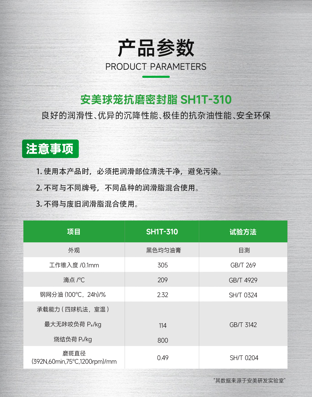 关于安美球笼抗磨密封脂SH1T-310的其它具体指标参数,请移步”安美商城”下载MSDS和TDS报告浏览,或直接润滑脂生产厂家-安美集团客服热线400-7788-123/客服微信18576991625查询索取。