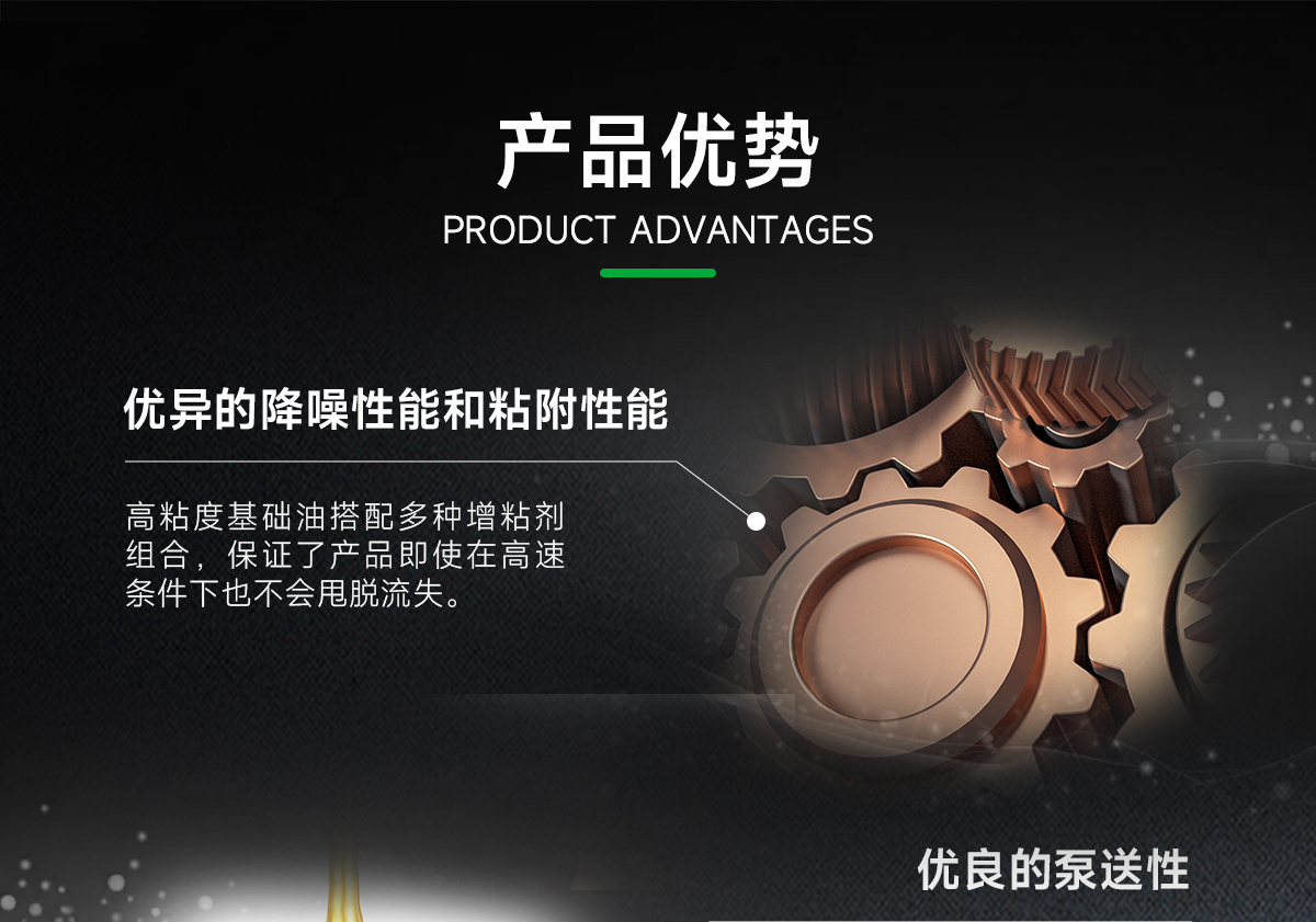 1、优异的降噪性能和粘附性能:高粘度基础油搭配多种增粘剂组合,保证了产品即使在高速条件下也不会甩脱流失。