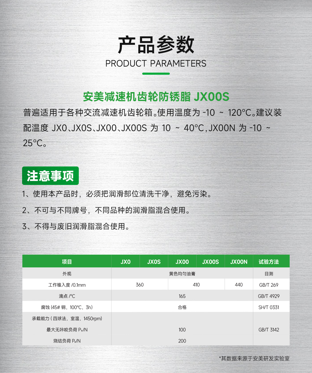 关于安美减速机齿轮防锈脂JX的其它具体指标参数,请移步”安美商城”下载MSDS和TDS报告浏览,或直接润滑脂生产厂家-安美集团客服热线400-7788-123/客服微信18576991625查询索取。