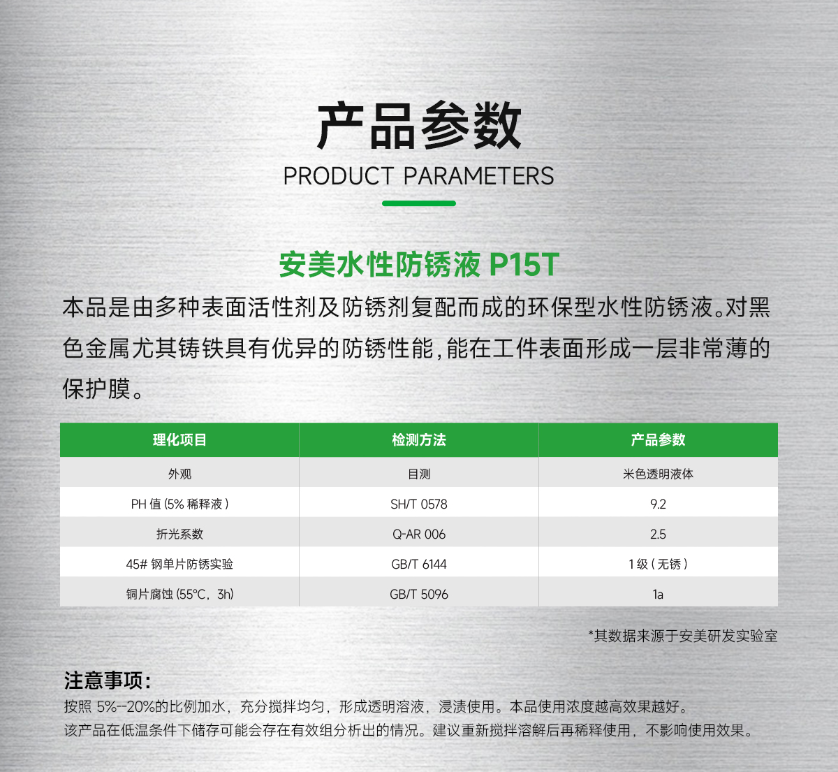 关于安美水性防锈液P15T的其它具体指标参数,请移步”安美商城”下载MSDS和TDS报告浏览,或直接防锈液生产厂家-安美集团客服热线400-7788-123/客服微信18576991625查询索取。