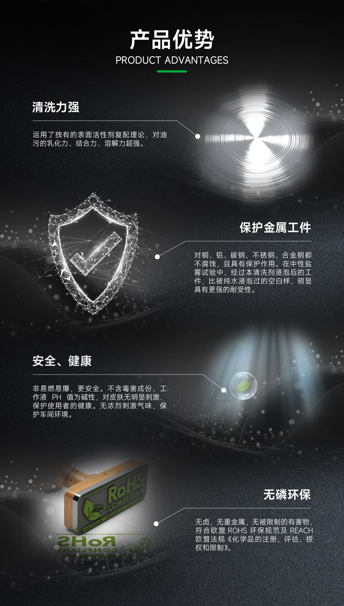 3、安全、健康:非易燃易爆,更安全。不含毒害成份,工作液 PH 值为碱性,对皮肤无明显刺激,保护使用者的健康。无浓烈刺激气味,保护车间环境。