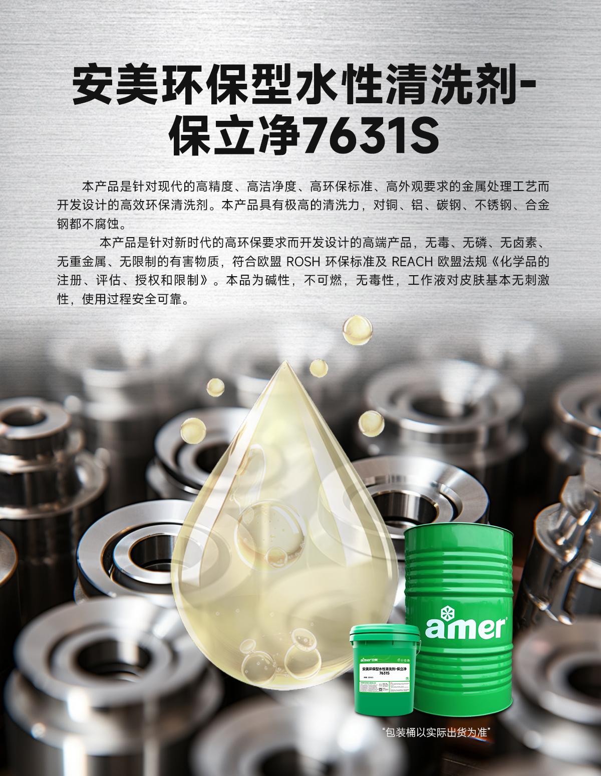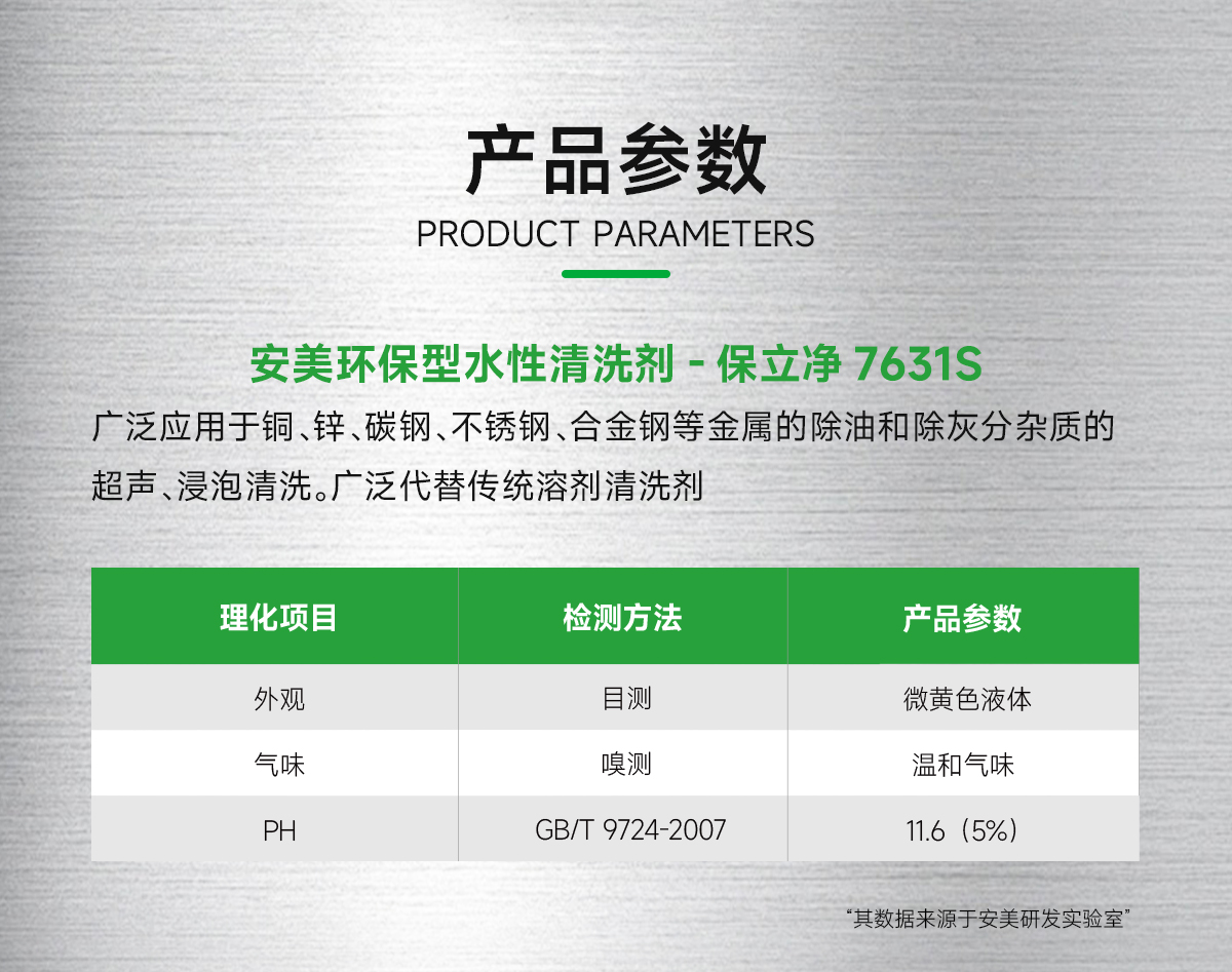 安美环保水性清洗剂 保立净7631S是针对现代的高精度、高洁净度、高环保标准、高外观要求的金属处理工艺而开发设计的高效环保清洗剂。本产品具有极高的清洗力,对铜、铝、碳钢、不锈钢、合金钢都不腐蚀。