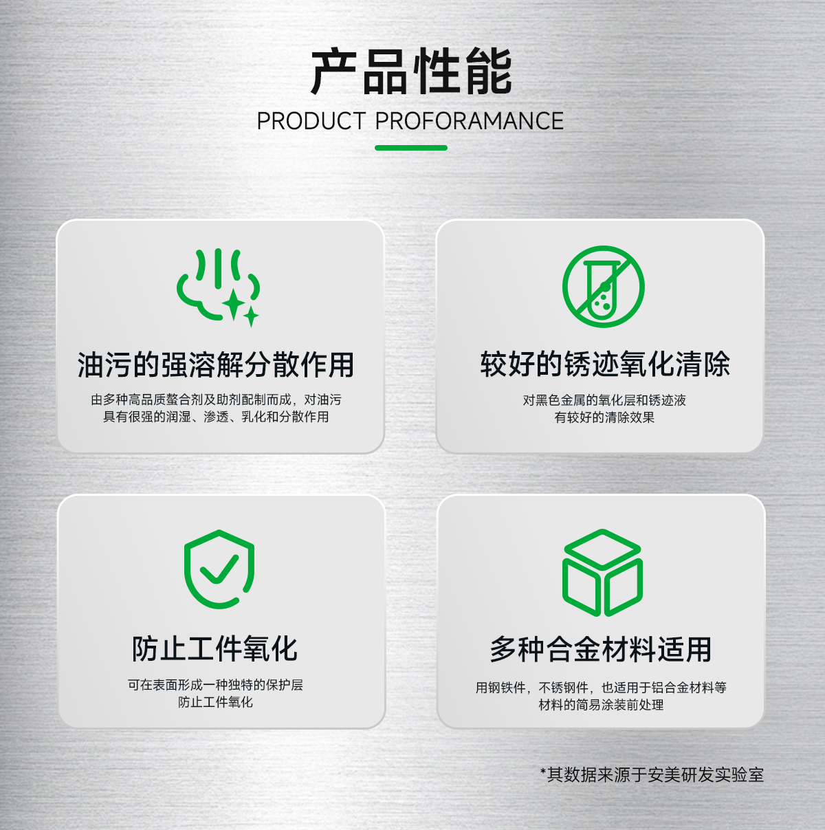 安美六合一皮膜剂 保立美7886是多功能合一的复合产品,由多种高品质螯合剂及助剂配制而成,对油污具有很强的润湿、渗透、乳化和分散作用,对黑色金属的氧化层和锈迹液有较好的清除效果,同时可再表面形成一种独特的保护层,防止工件氧化,适用钢铁件,不锈钢件,也适用于铝合金材料等材料的简易涂装前处理。