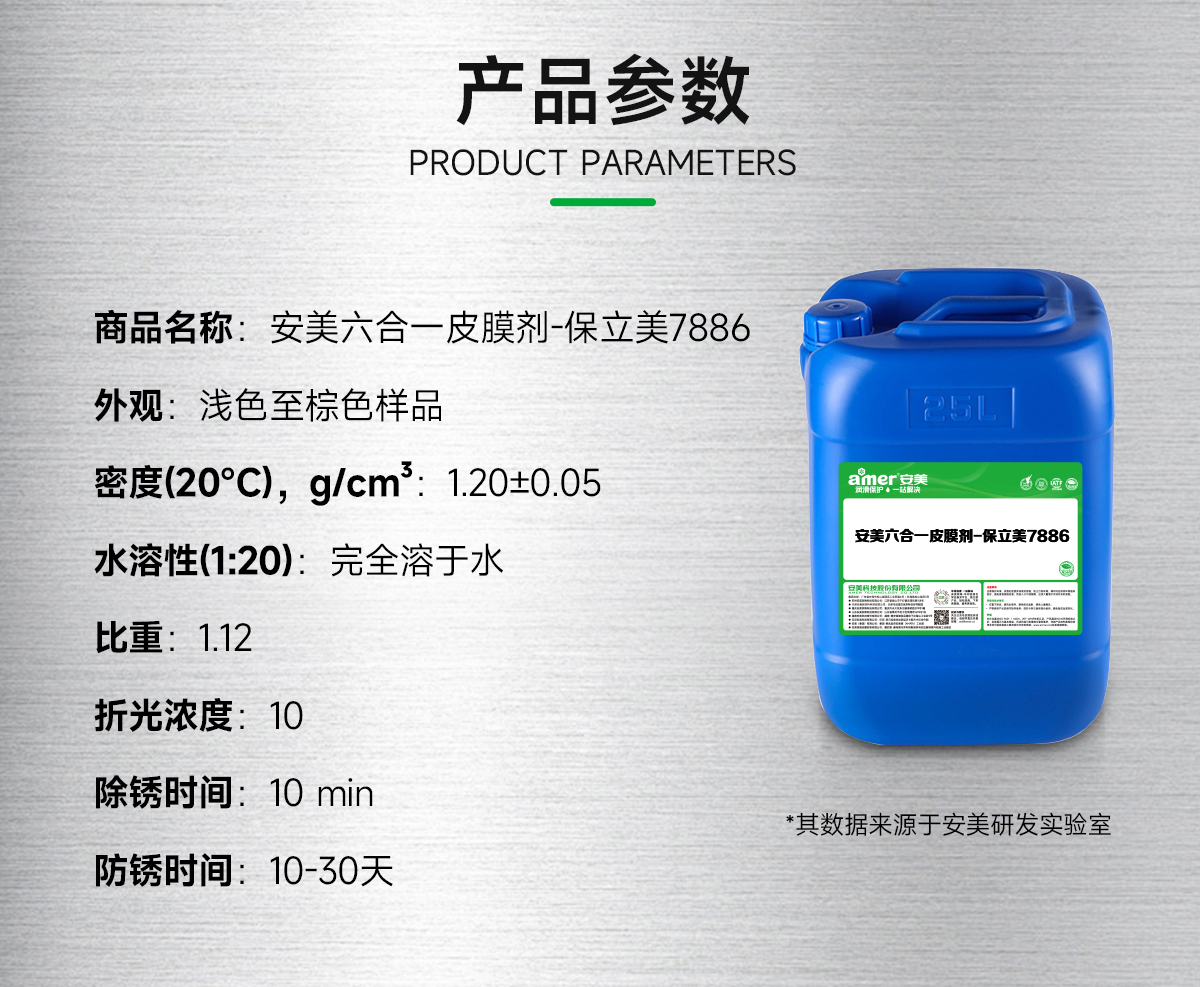 关于安美六合一皮膜剂 保立美7886的其它具体指标参数,请移步”安美商城”下载MSDS和TDS报告浏览,或直接皮膜剂生产厂家—安美集团客服热线400-7788-123/客服微信18576991625查询索取。